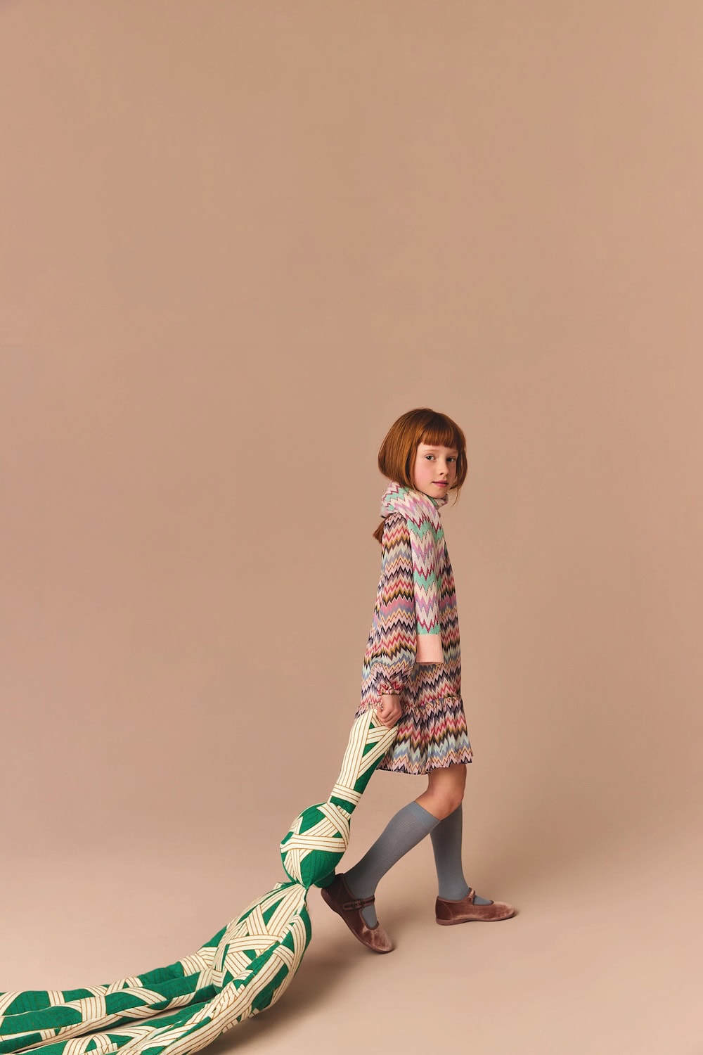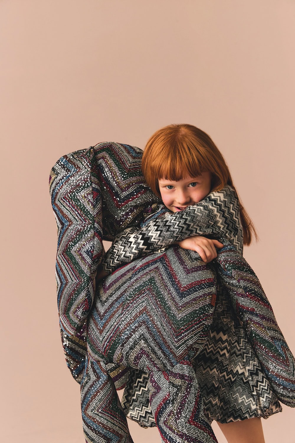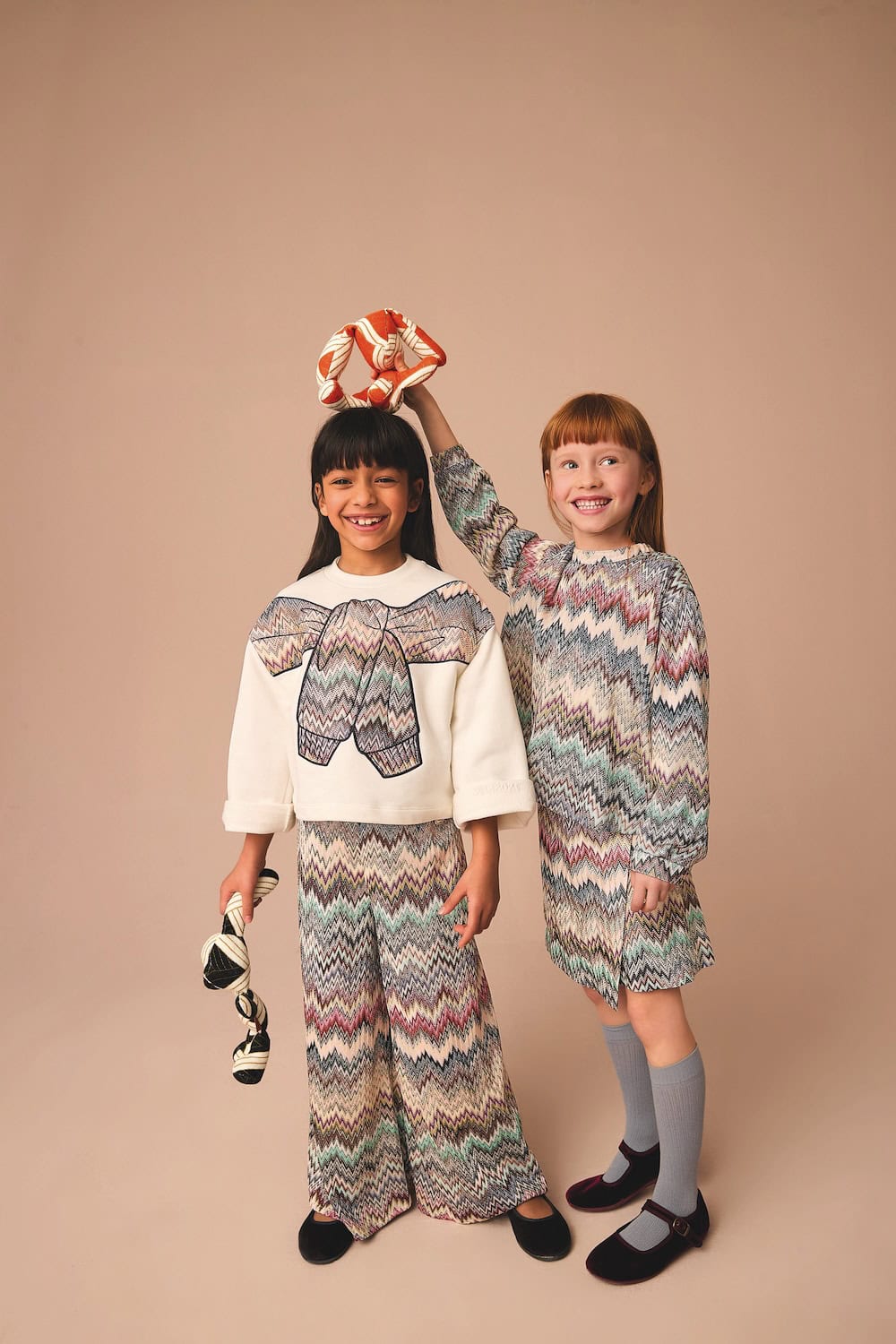 Strong colours and energetic tones grace the mini-me garments, which borrow the multi-colour look, in its many facets, from the adult collection: the down jacket and lightly padded overpants are designed for the harshest of climates, while the Mongolian cape – in a sophisticated shade of burgundy – boasts a contrasting printed nylon interior. The milk-hued sweatshirts with trompe-l’oeil raschel inserts and sporty flavour are contrasted by the floaty chiffon dresses, while the original Seagull stitch bestows a unique embossed effect upon the knitted trousers. Last but not least, natural nuances characterise the most formal proposals: the coat with Sixties line, the jacket and skirt ensemble and the viscose jacquard dress are available in an elegant cream colour on which the zigzag is more discreet, before then becoming more evident in its interpretation in multicoloured sequins and warm tones.