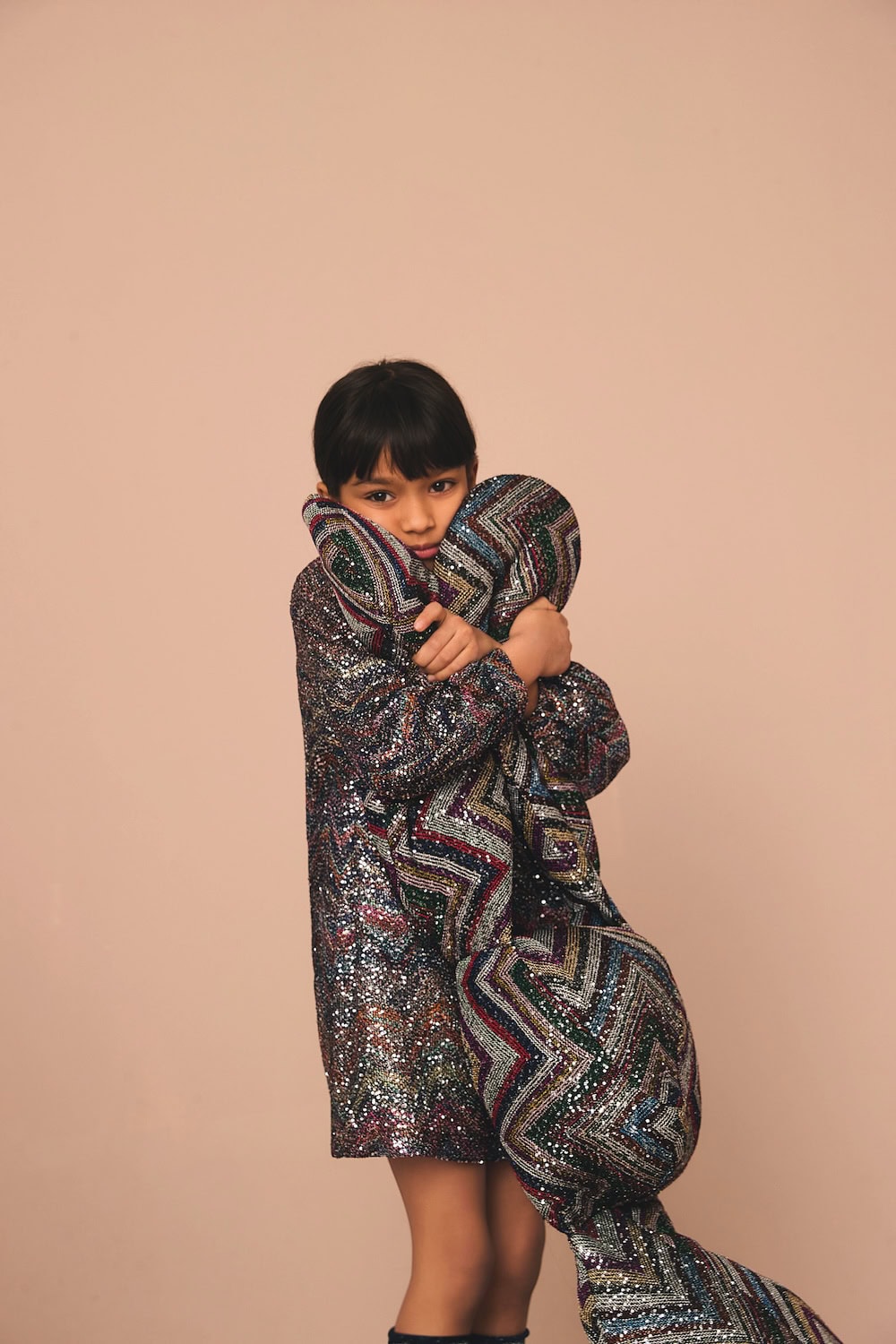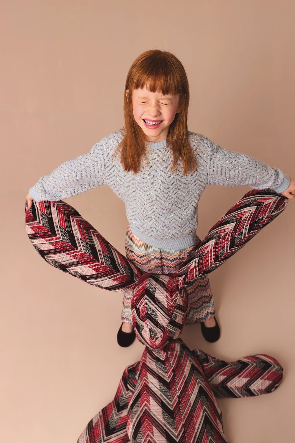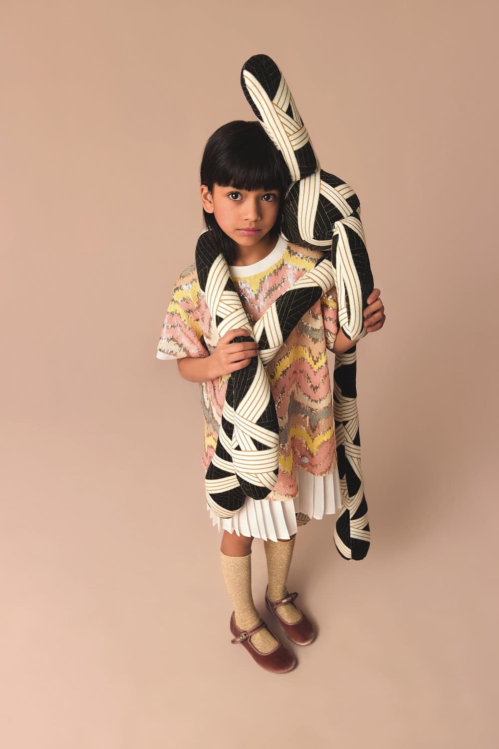 Strong colours and energetic tones grace the mini-me garments, which borrow the multi-colour look, in its many facets, from the adult collection: the down jacket and lightly padded overpants are designed for the harshest of climates, while the Mongolian cape – in a sophisticated shade of burgundy – boasts a contrasting printed nylon interior. The milk-hued sweatshirts with trompe-l’oeil raschel inserts and sporty flavour are contrasted by the floaty chiffon dresses, while the original Seagull stitch bestows a unique embossed effect upon the knitted trousers. Last but not least, natural nuances characterise the most formal proposals: the coat with Sixties line, the jacket and skirt ensemble and the viscose jacquard dress are available in an elegant cream colour on which the zigzag is more discreet, before then becoming more evident in its interpretation in multicoloured sequins and warm tones.