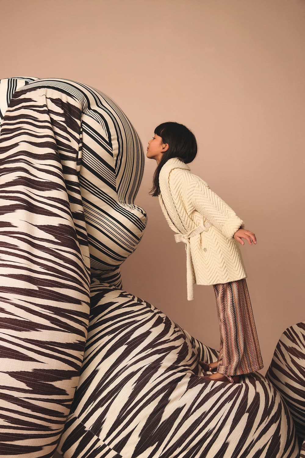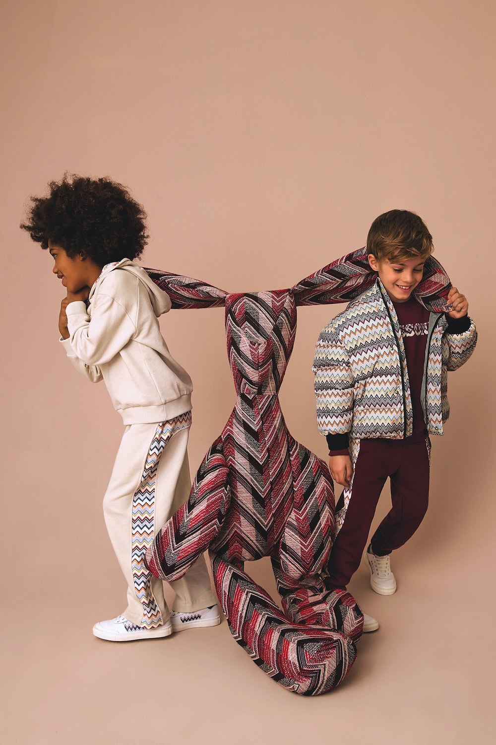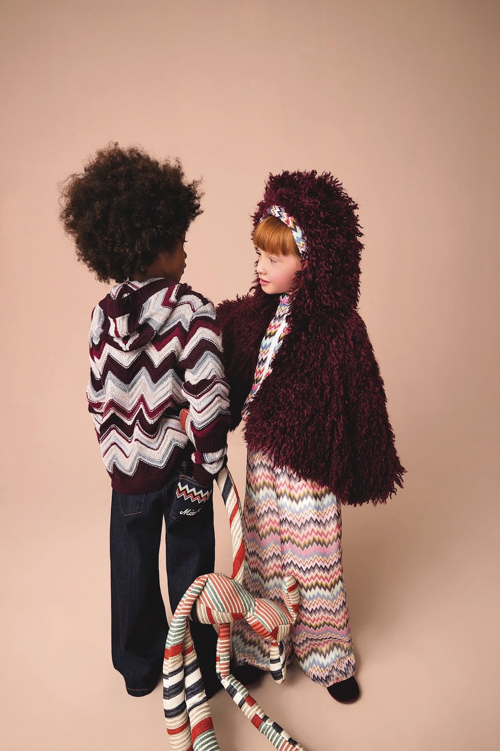 The proposals for boys choose the characteristic Missoni chevron as the leitmotif of the collection, in its many different manifestations: in the jacket and trouser ensemble, it transforms into an all-black tonal jacquard, while in the down jacket, it becomes a play of stitching, and a printed graffiti effect in the sweatshirt. The classic coat and double-breasted caban are crafted from the exclusive Caperdoni loom to create the zigzag in shades of grey, as well as on the Linz-knit sweater and sweatshirt that combines contrasting jersey and knit. The original combination of jersey and raschel also features in the mini-me proposals inspired by the lines of the Men’s collection: the trousers and sweatshirt and the T-shirt and polo shirt alternate the solid colour of the exquisitely autumnal nuances with the explosion of colour provided by the kaleidoscopic all-over zigzag. The floating wave print, with an almost three-dimensional effect, is the cornerstone of the new knitwear proposal, alongside the classic macro zigzag and ribbon-effect print. Lastly, intense blue tones embellish the proposals that take their cue from the denim with embroidered chevron motif, combined with knitwear sporting the maxi zigzag and matching raschel T-shirt with degradé overdyeing.