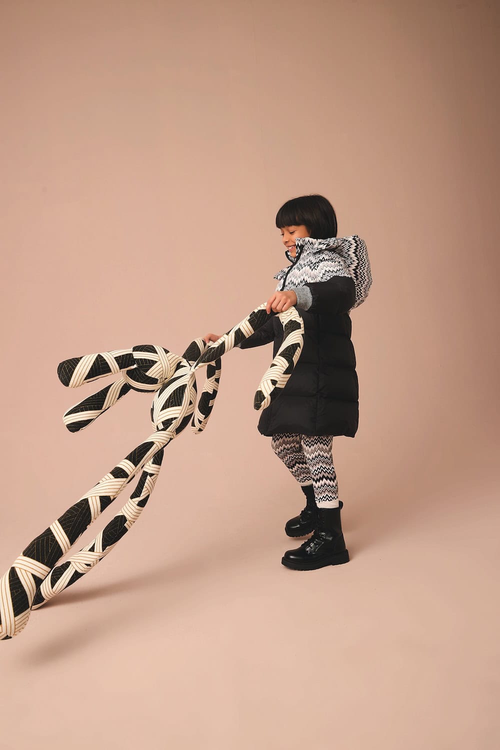 The Missoni Kids’ Fall-Winter ’25 Collection interprets the Maison’s stylistic universe in a mini-me key, re-defining its lines and proportions: the garments – expressly dedicated to little ones – play with unmistakably Missoni motifs and nuances, in a kaleidoscope of geometries that take their cue from tradition before evolving into surprising variations. The timeless allure of black and white animates the collection dedicated to girls, by playing with infinite shades of grey in the raschel knitwear proposals that feature the characteristic Missoni zigzag: from the bon-ton dress to the wide trousers, from the enveloping maxi-cardigan to the details of the sweatshirt with glitter logo, the chevron motif is transformed into an alternating and decisive light and dark contrast. Total black for both the faux fur jacket and jacquard knit jacket with close-fitting proportions, where the embroidered macro zigzag becomes three-dimensional.