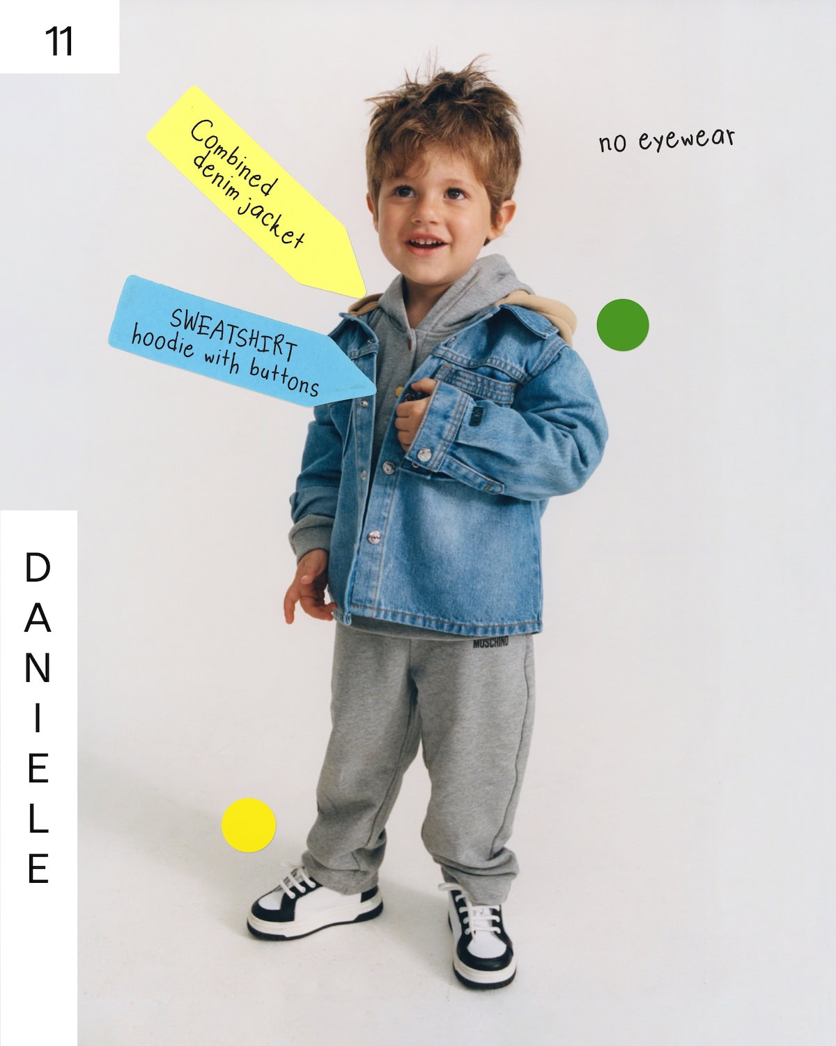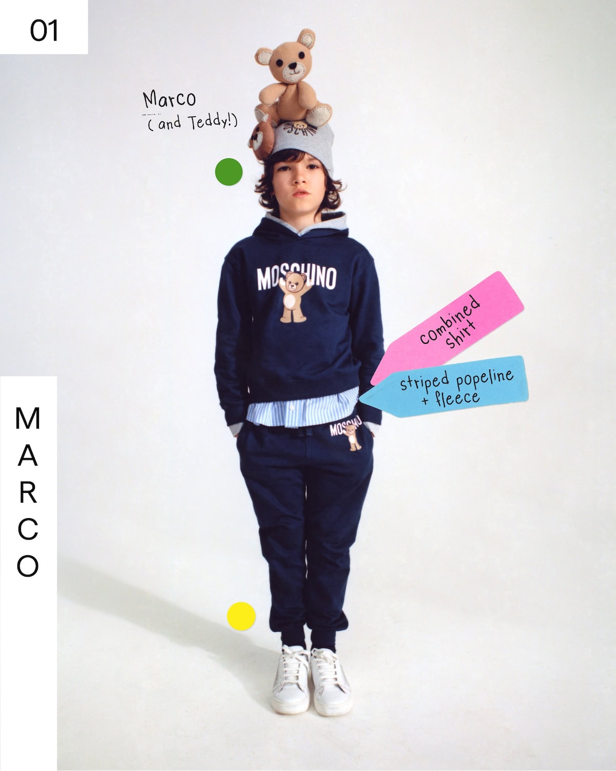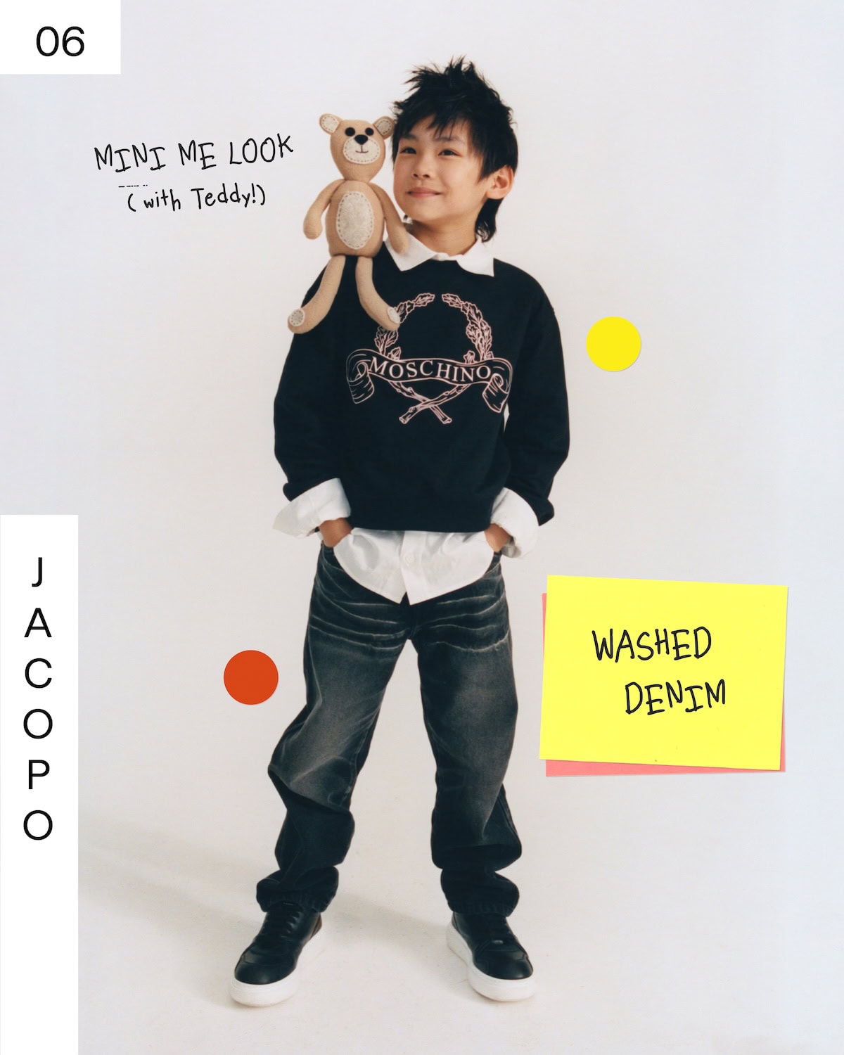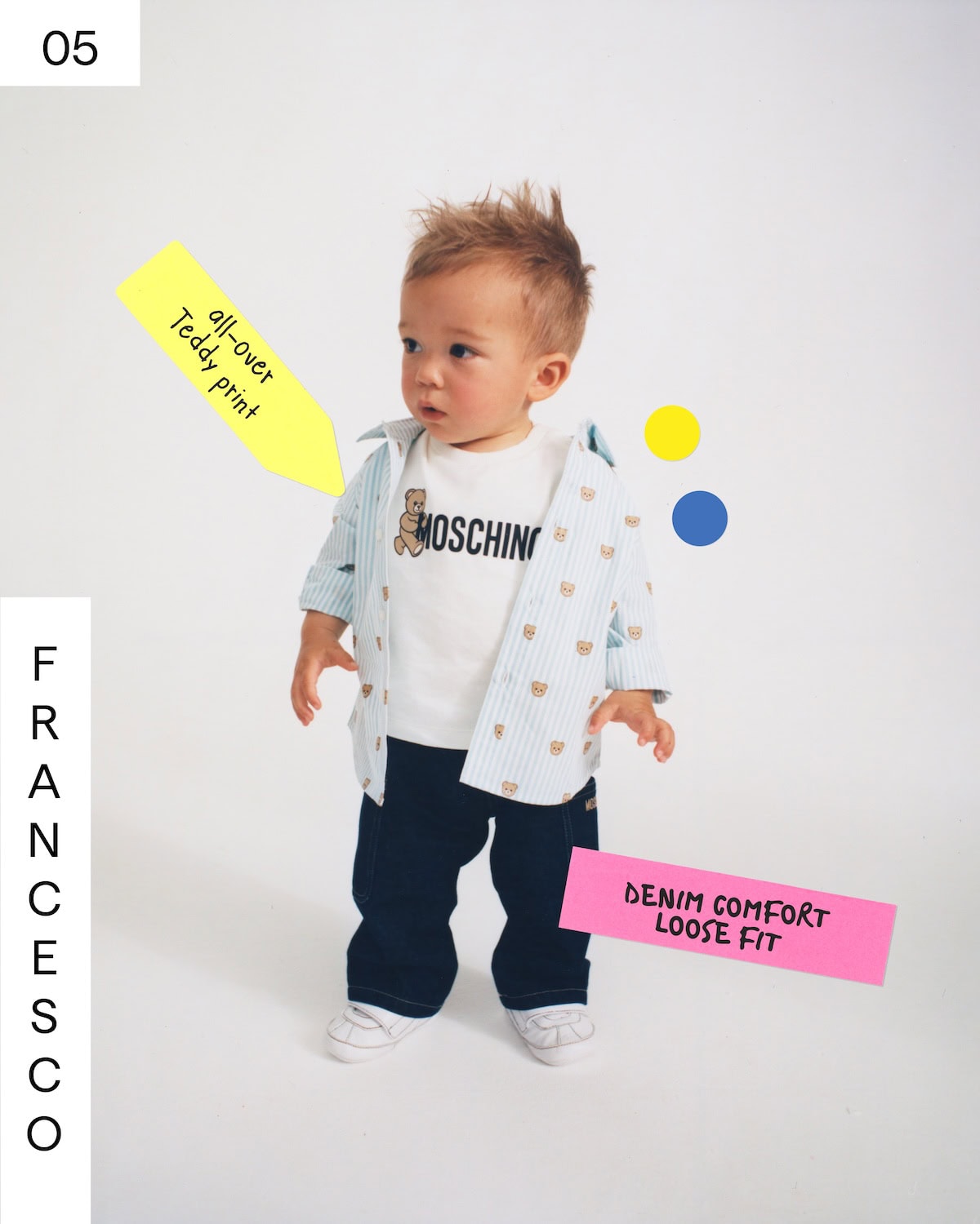 As every year, the Mini Me looks return, inspired by the adult collections. The collaboration with Smiley continues, offering casual pieces featuring prints or the iconic logo composed of micro-studs. For girls, the theme is enriched with jacquard argyle knitwear, intertwining Smiley and red hearts, a signature symbol of the Moschino brand. For bold and edgy looks, the soft-textured black denim with a streaked wash is the perfect choice. For girls, it is also available in vintage blue wash, with embroidered patches that add a special touch to jeans and miniskirts. The iconic Teddy Bear is renewed with the graphic evolution envisioned by Adrian Appiolaza, still sweet, yet cleaner and more contemporary. The collection offers a range of innovative and versatile pieces that make the Teddy Bear the star, both in casual and more formal versions, creating the perfect mix of elegance and modernity.