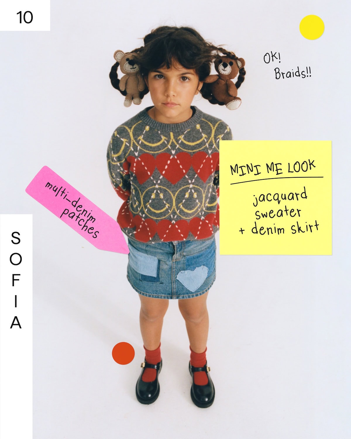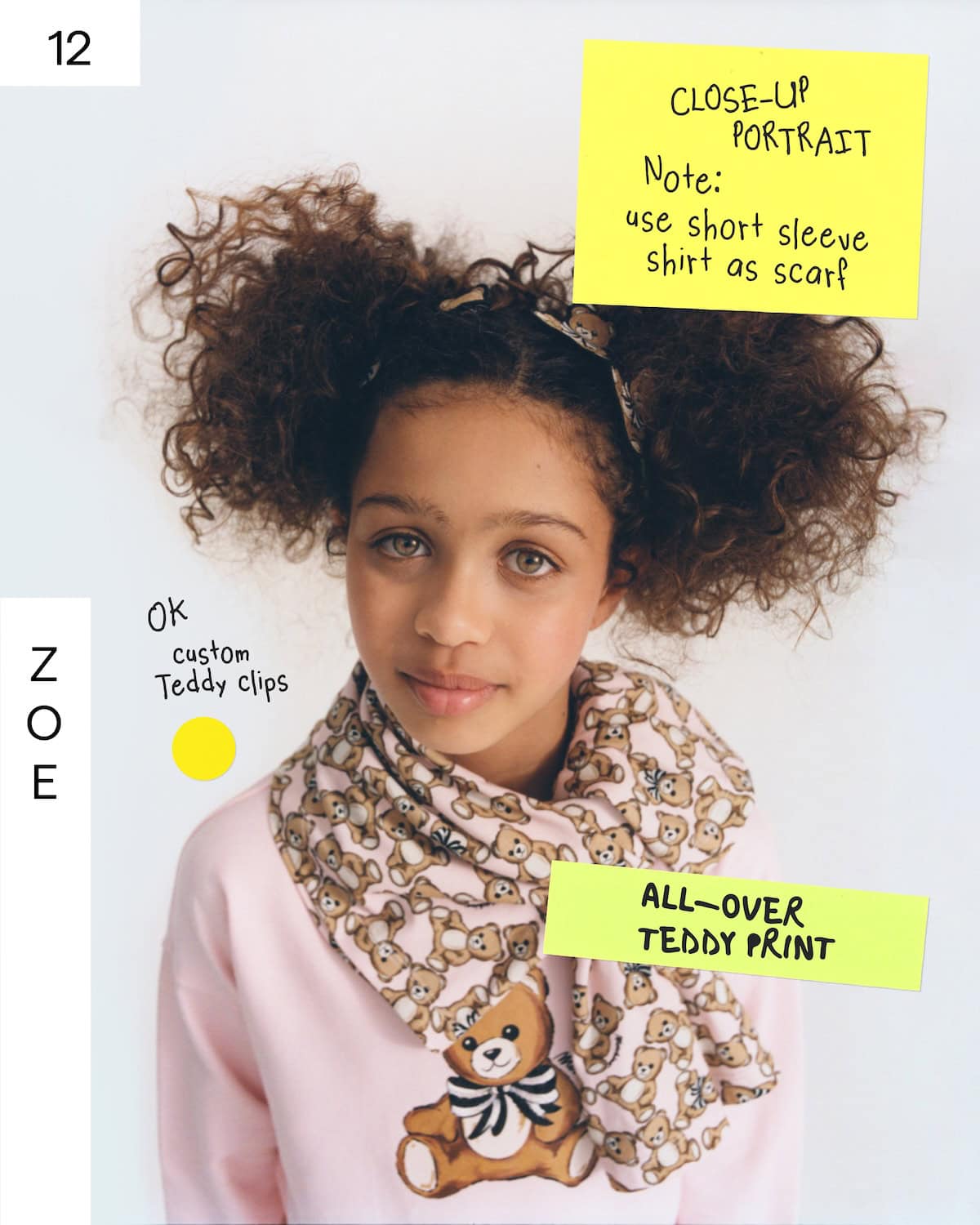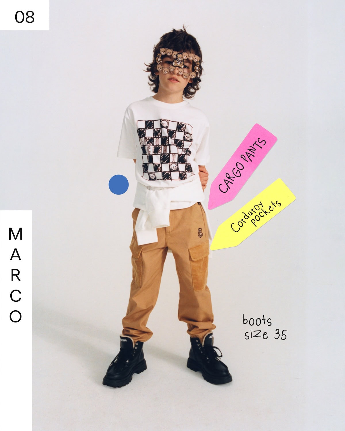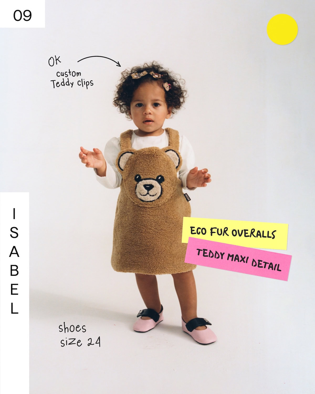 As every year, the Mini Me looks return, inspired by the adult collections. The collaboration with Smiley continues, offering casual pieces featuring prints or the iconic logo composed of micro-studs. For girls, the theme is enriched with jacquard argyle knitwear, intertwining Smiley and red hearts, a signature symbol of the Moschino brand. For bold and edgy looks, the soft-textured black denim with a streaked wash is the perfect choice. For girls, it is also available in vintage blue wash, with embroidered patches that add a special touch to jeans and miniskirts. The iconic Teddy Bear is renewed with the graphic evolution envisioned by Adrian Appiolaza, still sweet, yet cleaner and more contemporary. The collection offers a range of innovative and versatile pieces that make the Teddy Bear the star, both in casual and more formal versions, creating the perfect mix of elegance and modernity.
