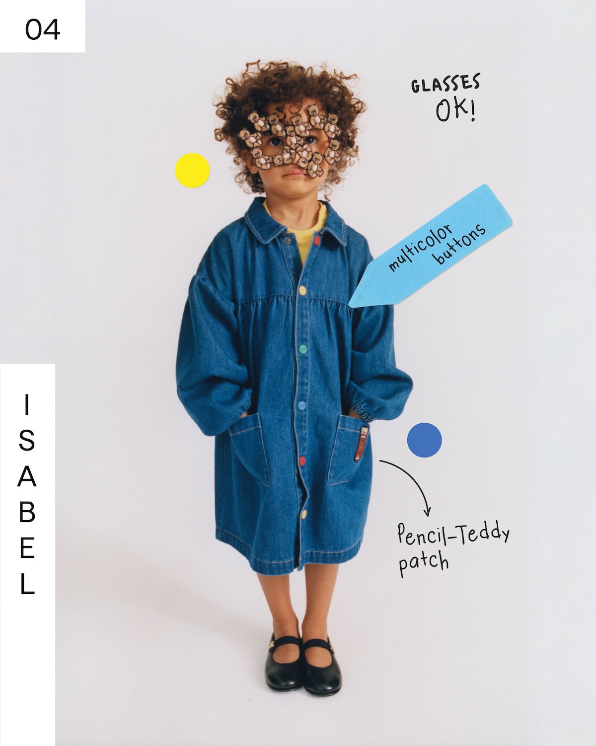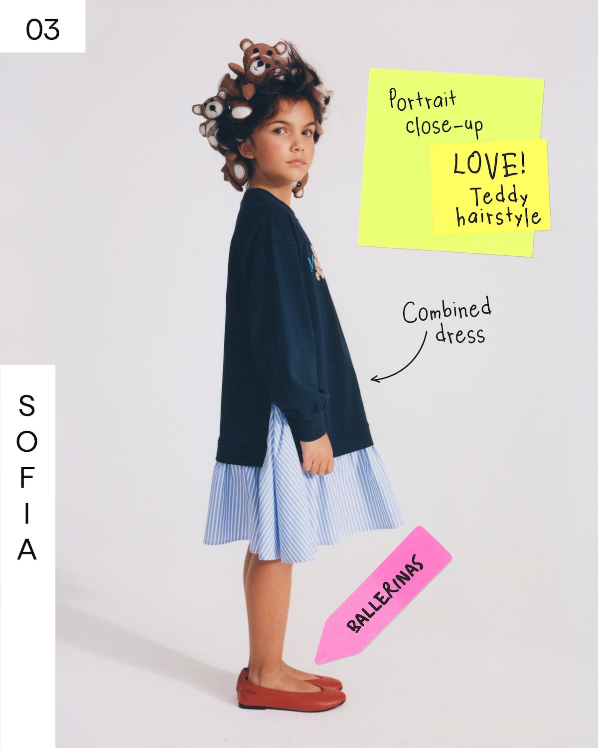 For back to school, the pieces are sporty yet cool. For older kids, multi-color logo graphics appear on shirts and dresses featuring striped poplin inserts. The collection also includes pieces such as pocketed down jackets, shirts, dresses, and pants that mix fabrics like fine ribbed velvet and cotton ripstop. The youngest ones can have fun with graphics of colorful pencils and erasers playfully deleting the logo, on garments humorously customized with multicolor buttons. Girls of all ages will be enchanted by the Romantic Bears theme, featuring striped sequin bows or gold lurex embroidered ribbons, along with pink foil hearts—perfect for a sweet and playful look. The most special dresses come in velvet, embroidered tulle, and satin with an all-over print.