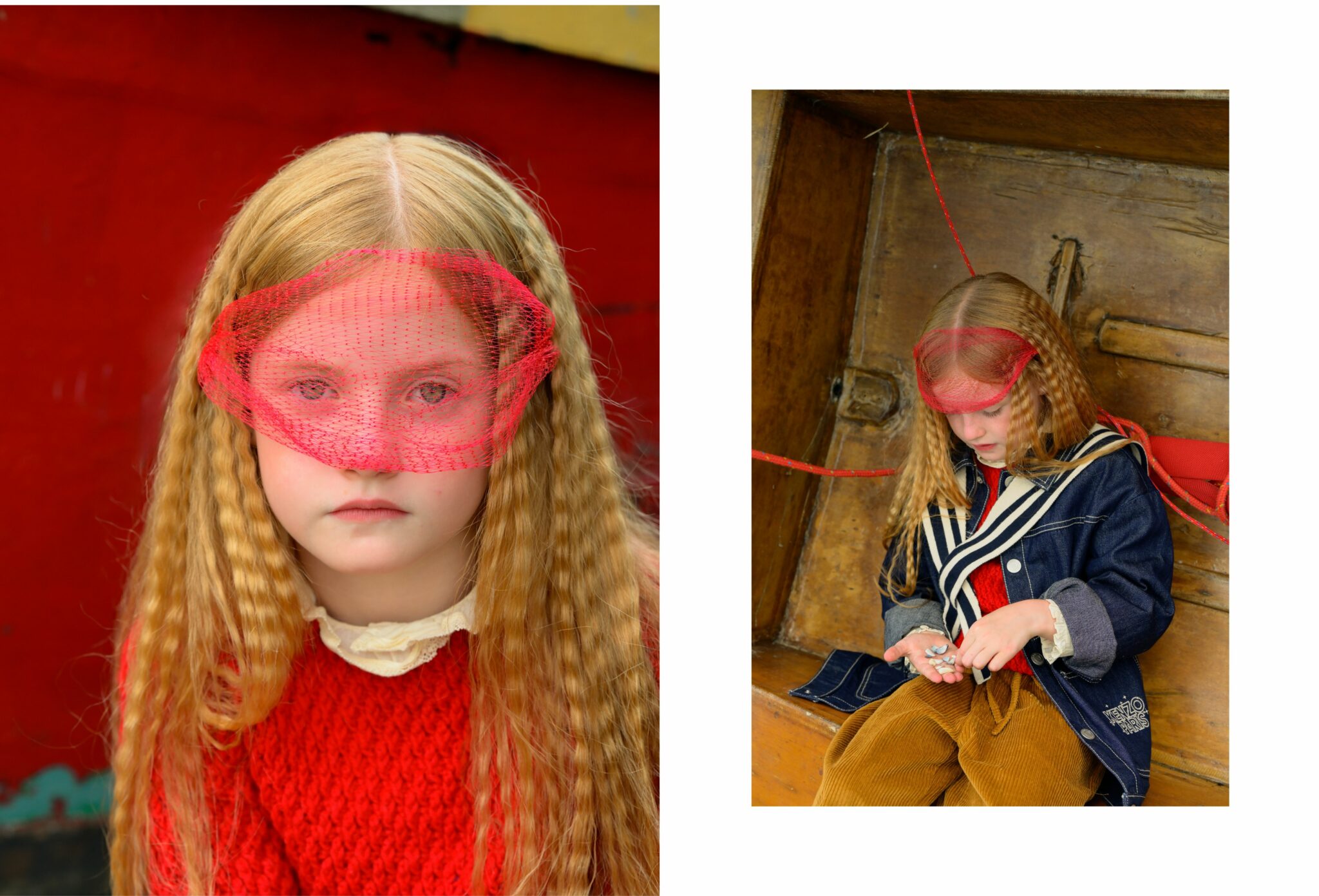 AMELIA – hair net (fruit packaging), frill blouse worn under jumper C’ERA UNA VOLTA, jumper YAARN, pants TANGERINE, jacket and collar KENZO KIDS.