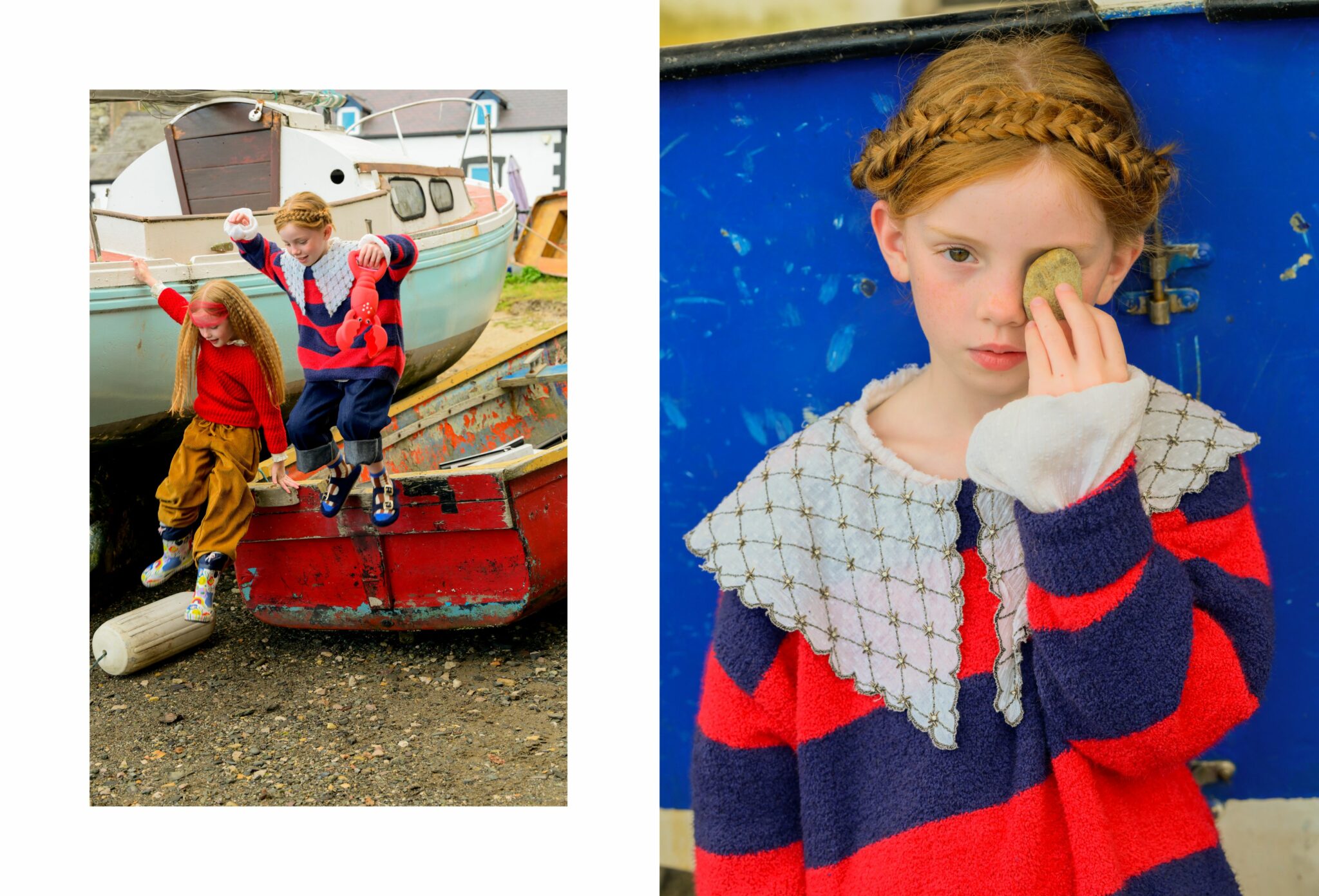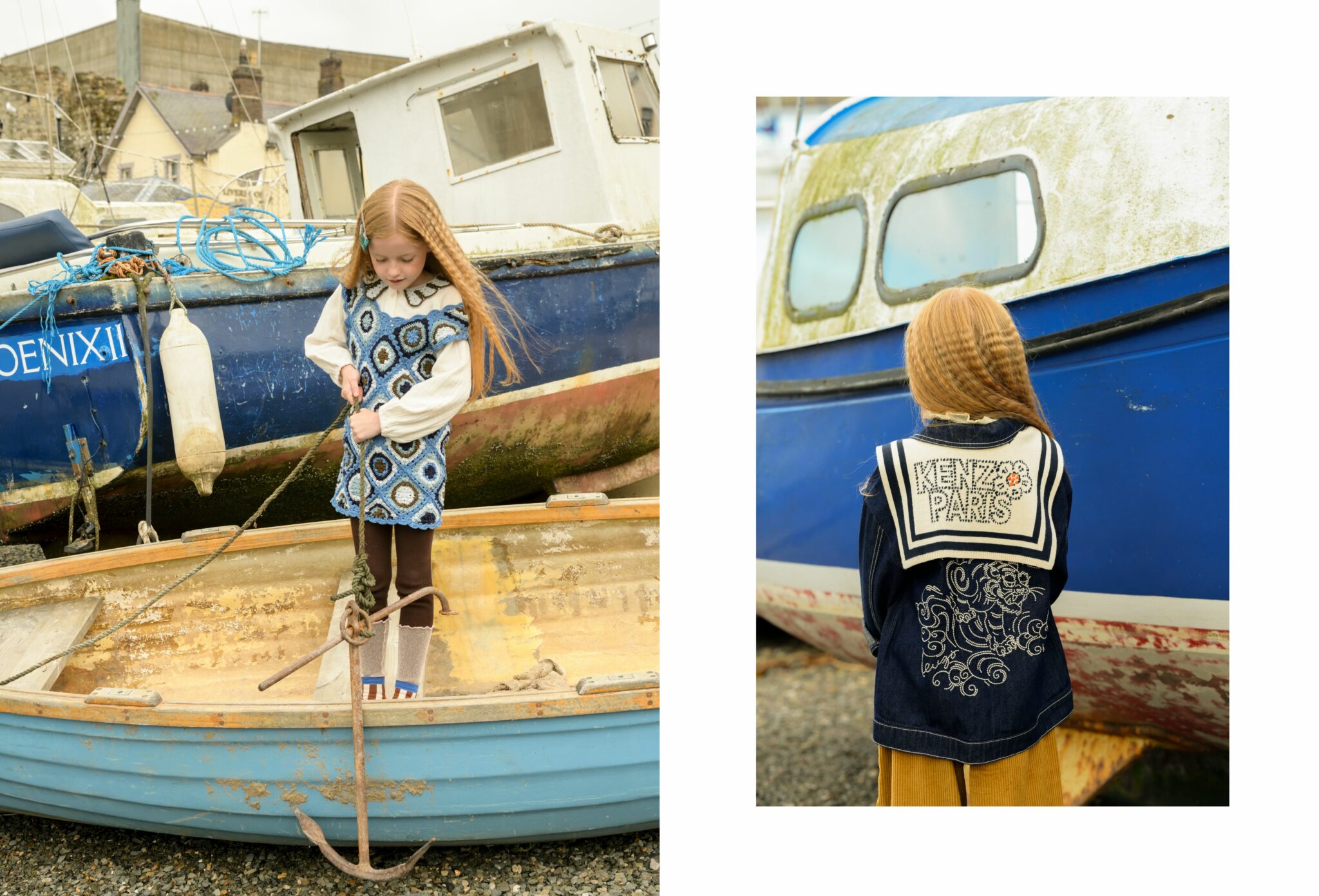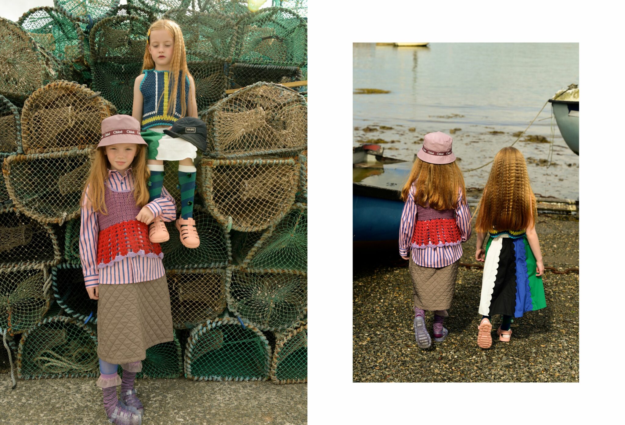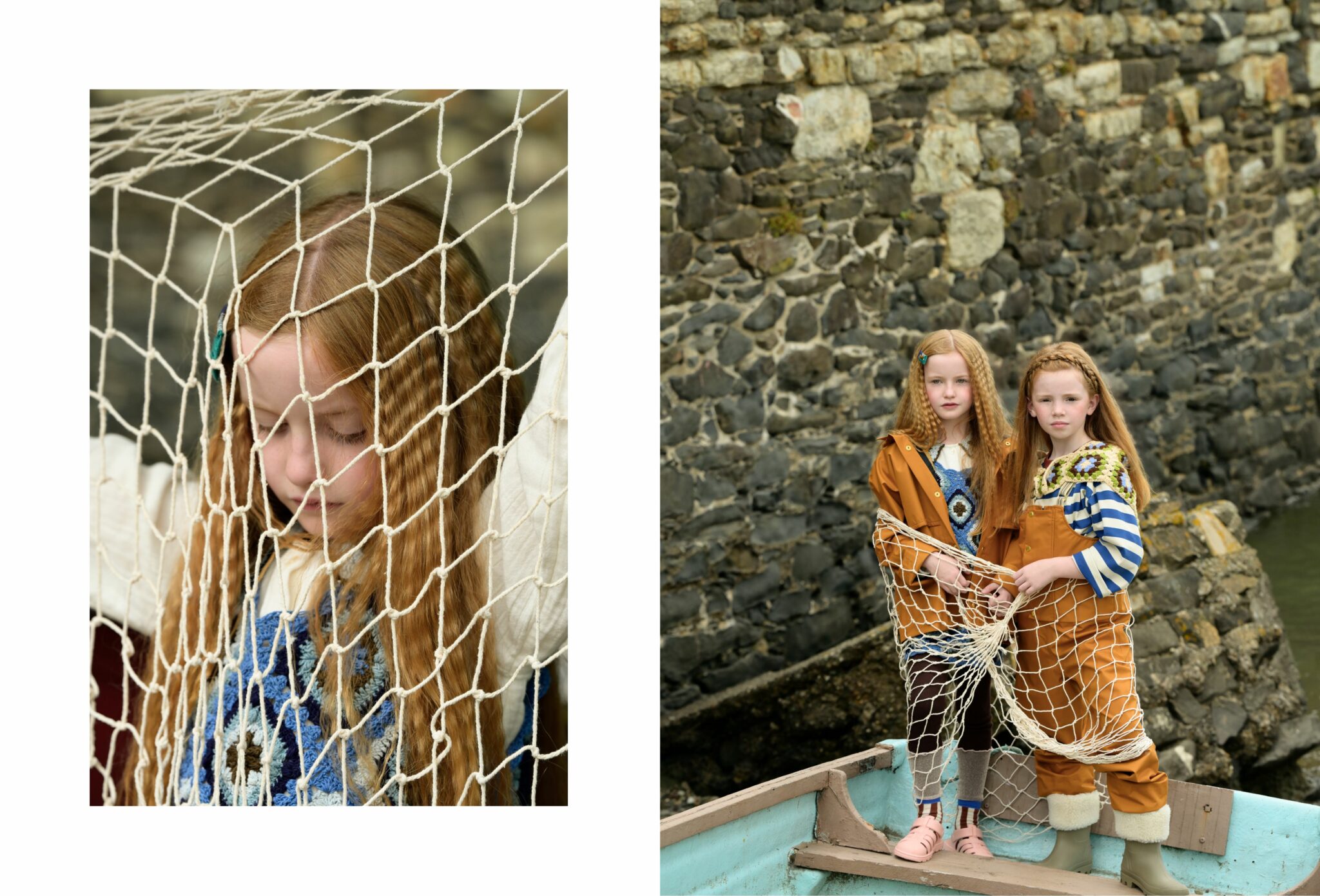 Fish & Chips is not just a story — it’s a mood. A playful tribute to sisterhood, freedom, and that slightly wild way of growing up by the sea. Set against the salty charm of Conwy, a historic fishing town on the North Wales coast, this editorial follows two girls who seem born from the waves — curious, bold, and beautifully rooted in their surroundings.