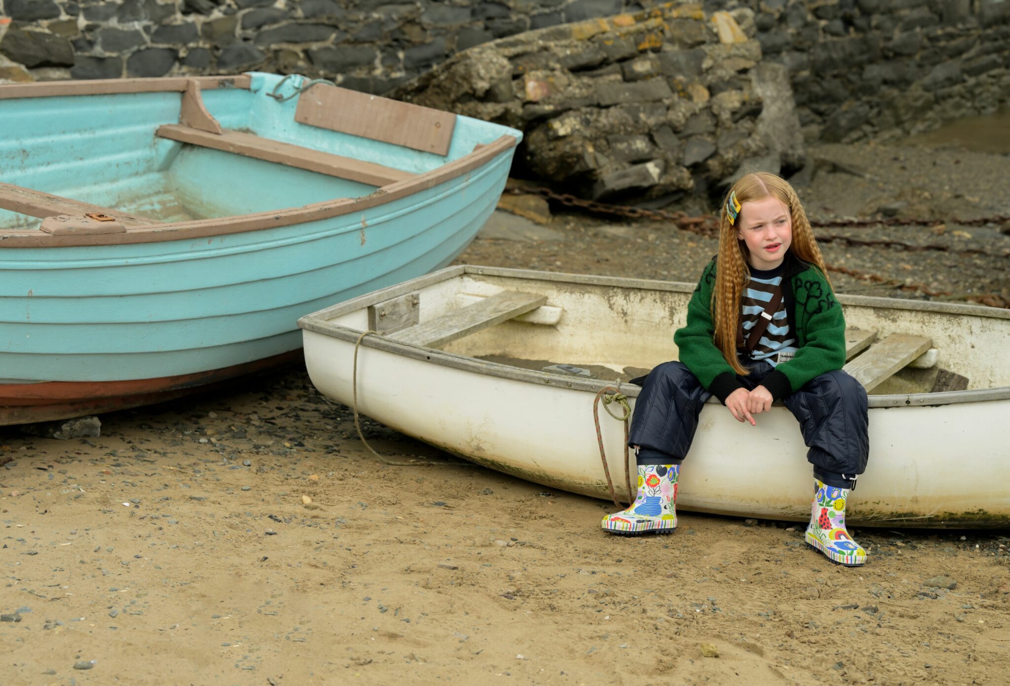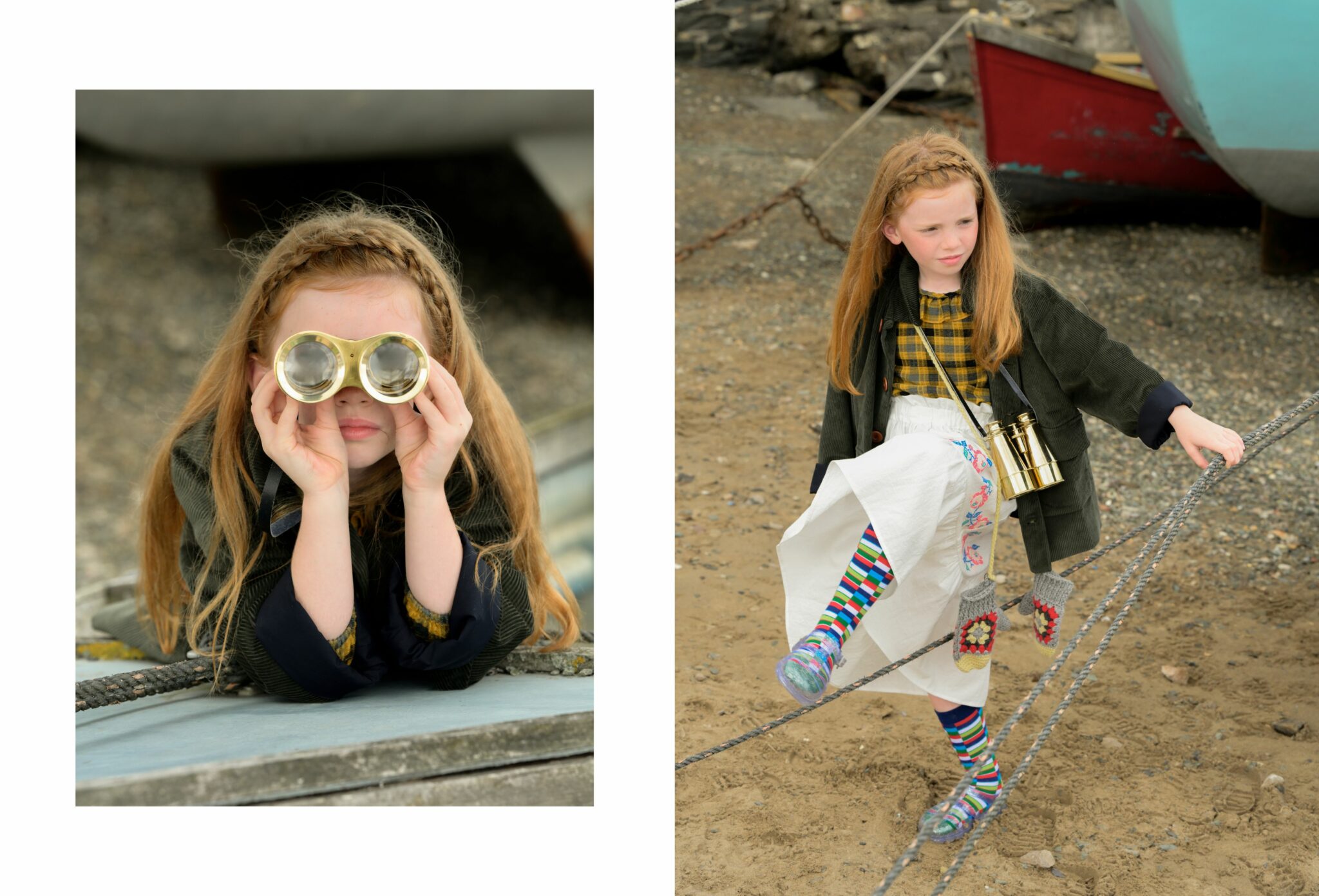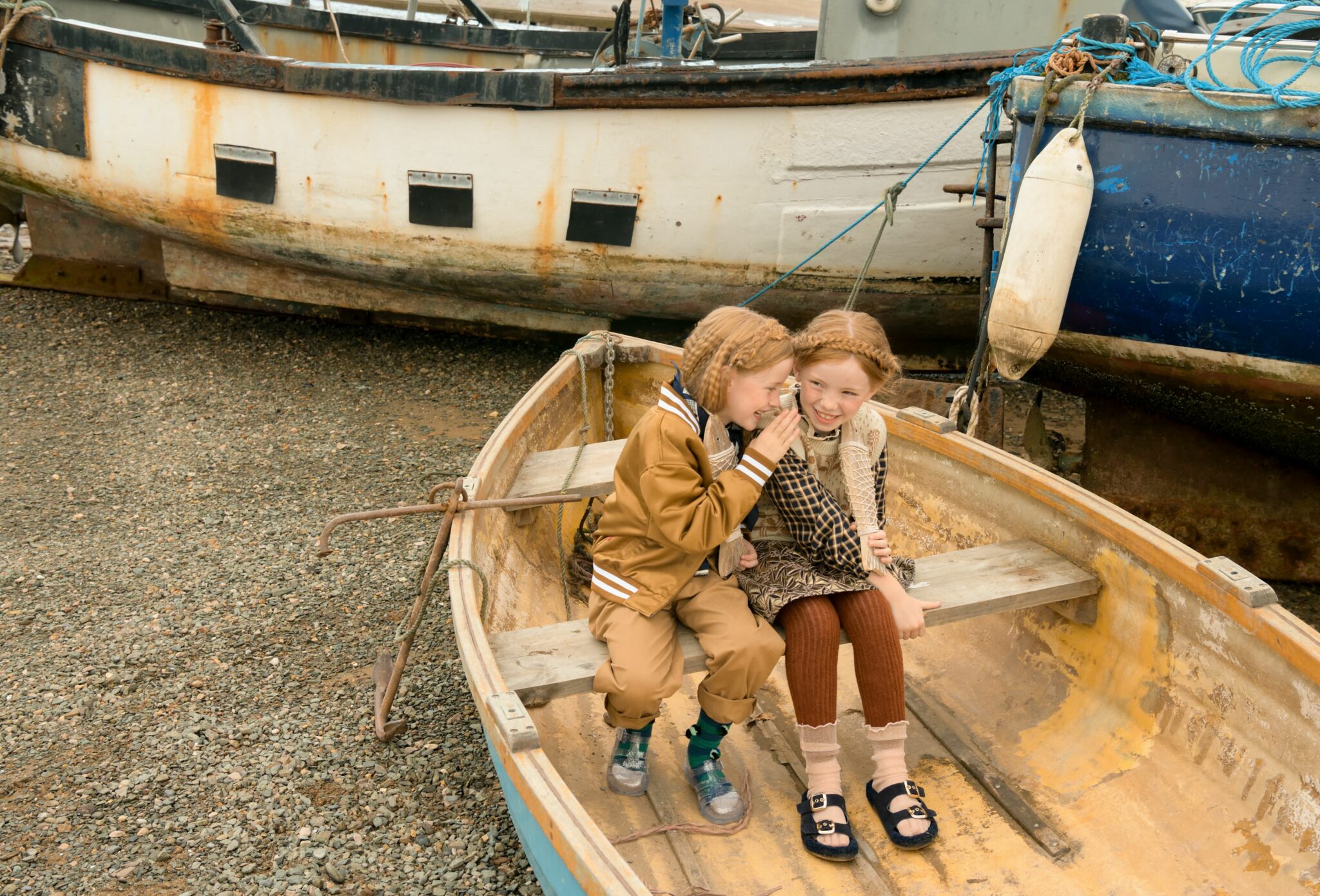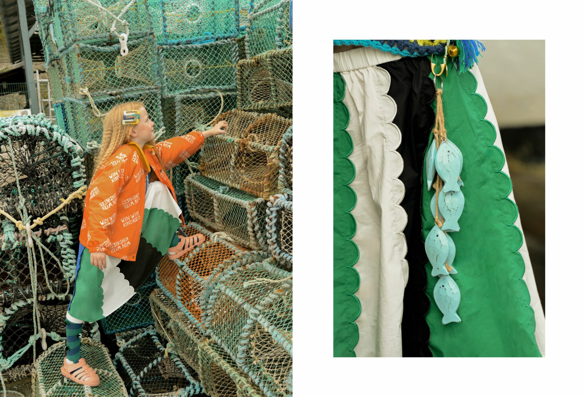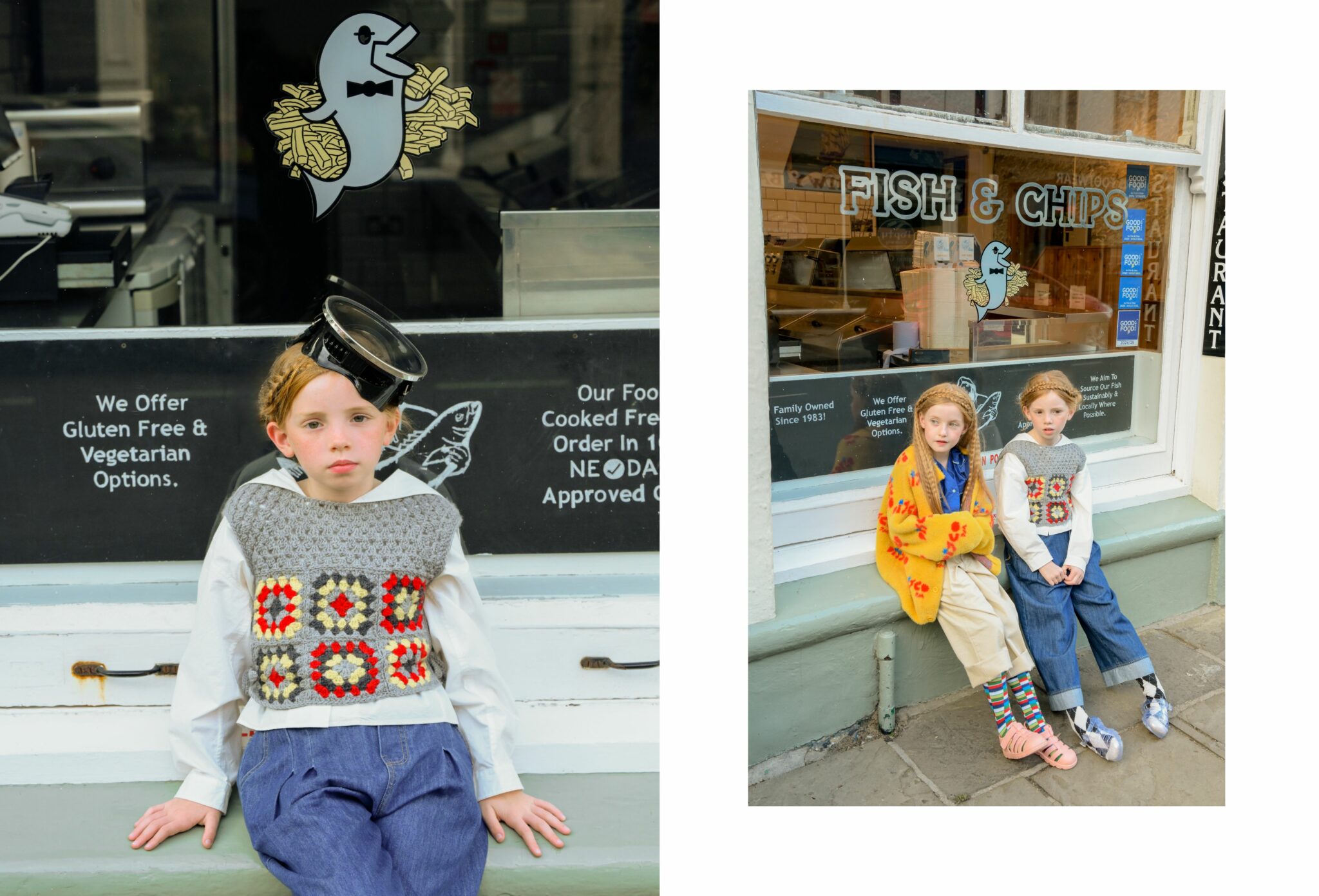 Fish & Chips is not just a story — it’s a mood. A playful tribute to sisterhood, freedom, and that slightly wild way of growing up by the sea. Set against the salty charm of Conwy, a historic fishing town on the North Wales coast, this editorial follows two girls who seem born from the waves — curious, bold, and beautifully rooted in their surroundings.