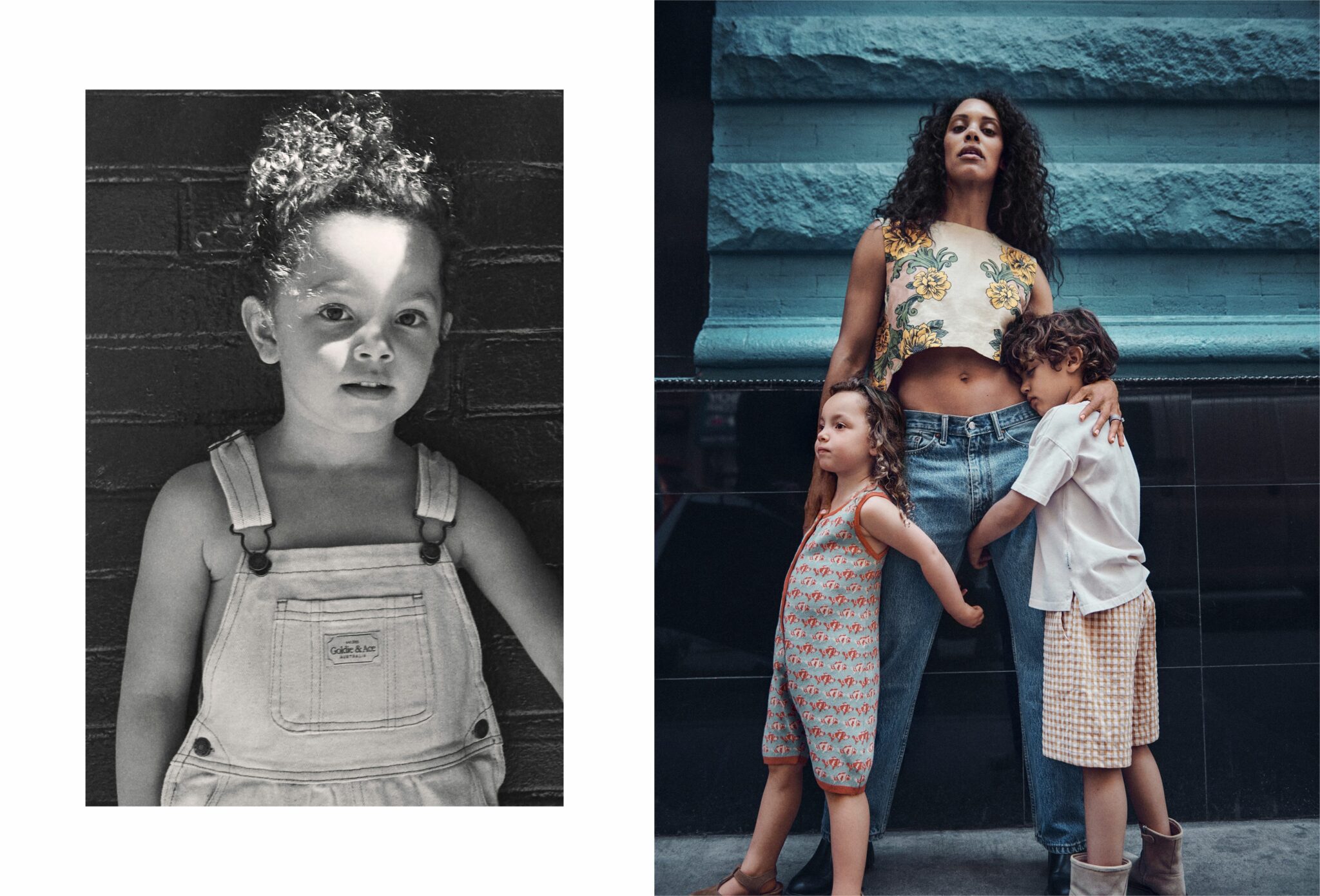 Left: Young child wearing light denim overalls by COKIE & ACE, standing in front of a dark brick wall, lit by natural light. Right: Woman in floral crop top and jeans standing against a teal wall, holding two children—girl in printed playsuit and boy in gingham shorts and boots, kidswear editorial scene in an urban setting. Let me know if you'd like to add the collection name or season!