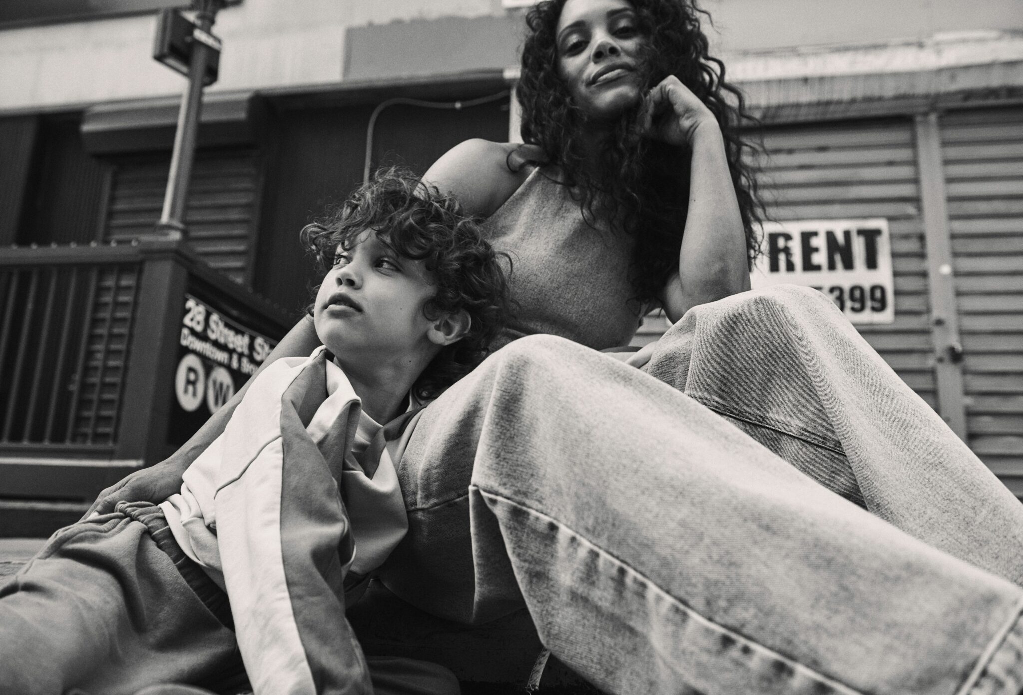 Black and white photo of a woman and a young boy sitting together on the sidewalk in front of the 28th Street Subway Station in New York City. The woman wears wide-leg jeans and a sleeveless top, while the boy leans against her in a relaxed pose, wearing a sporty tracksuit. Urban editorial moment with a casual, intimate vibe.
