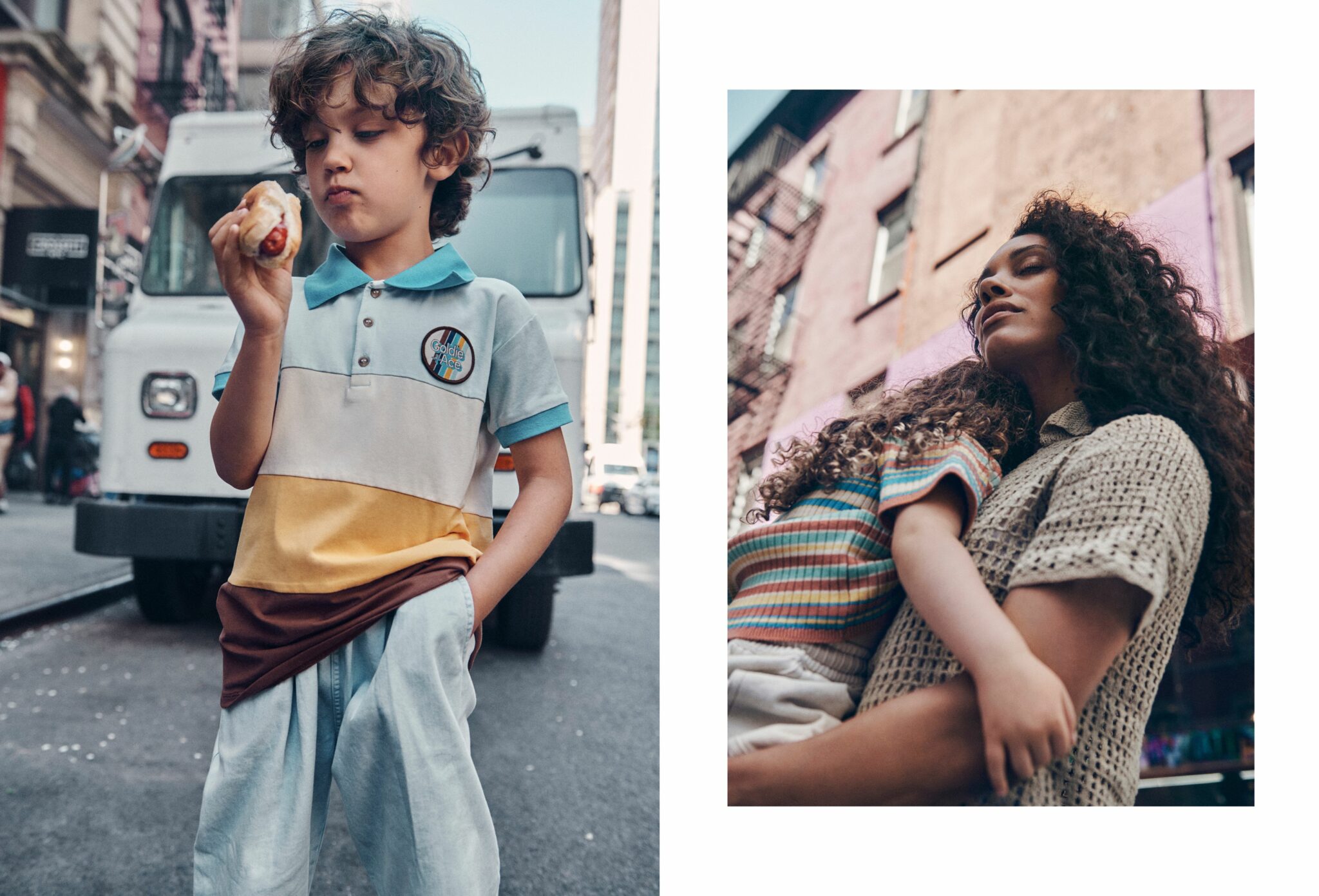 Left: Young boy standing in front of a food truck, holding a hot dog and wearing a retro-style color-block polo shirt with “Cookies & Faces” patch and loose-fitting trousers, street scene in New York City. Right: Woman in open-knit shirt cradling a child in a striped ribbed top, both with curly hair, standing in front of a pink building façade bathed in soft afternoon light.