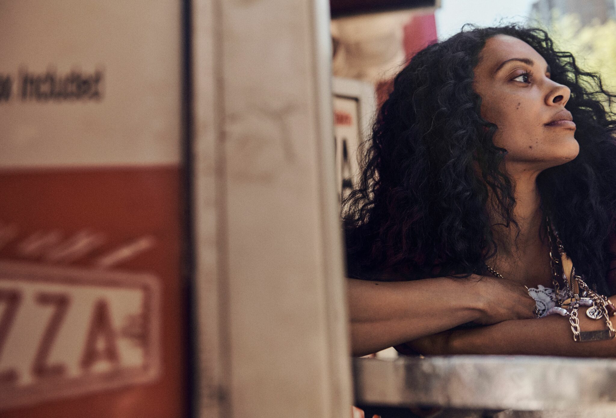 Woman with long curly hair leaning on a metal table outside a pizzeria, gazing thoughtfully into the distance. The photo is framed through a pizza sign, capturing a candid city moment in soft natural light with a nostalgic, summery feel.