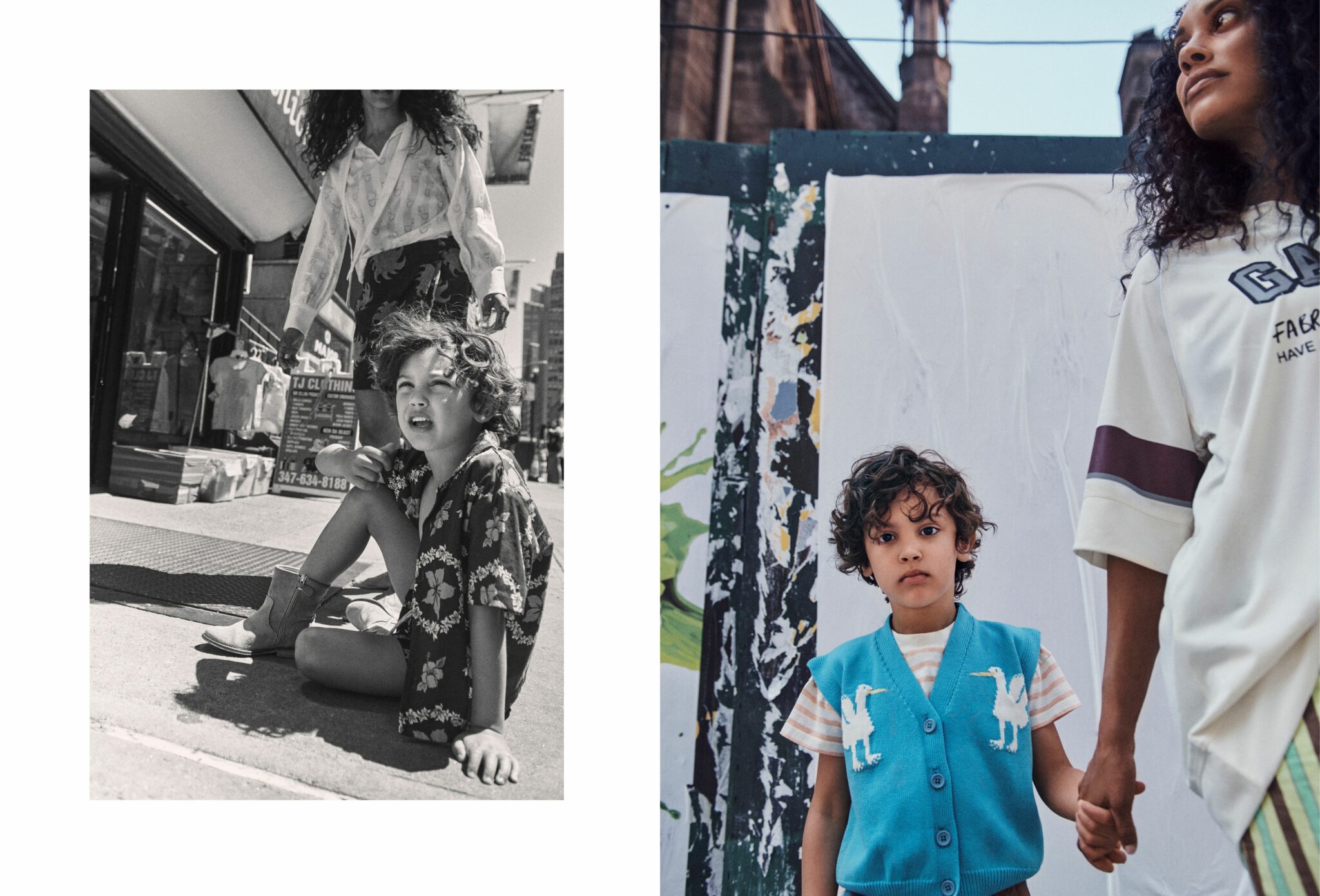 Left: Black and white photo of a boy sitting on the sidewalk in a floral shirt and cowboy boots, with a woman in a printed blouse walking behind him on a busy city street, evoking a candid summer-in-the-city vibe. Right: Color image of a young boy in a bright blue knitted vest with white bird motifs and striped tee, holding hands with a woman in a graphic oversized T-shirt, standing against a raw urban backdrop with painted wooden panels.