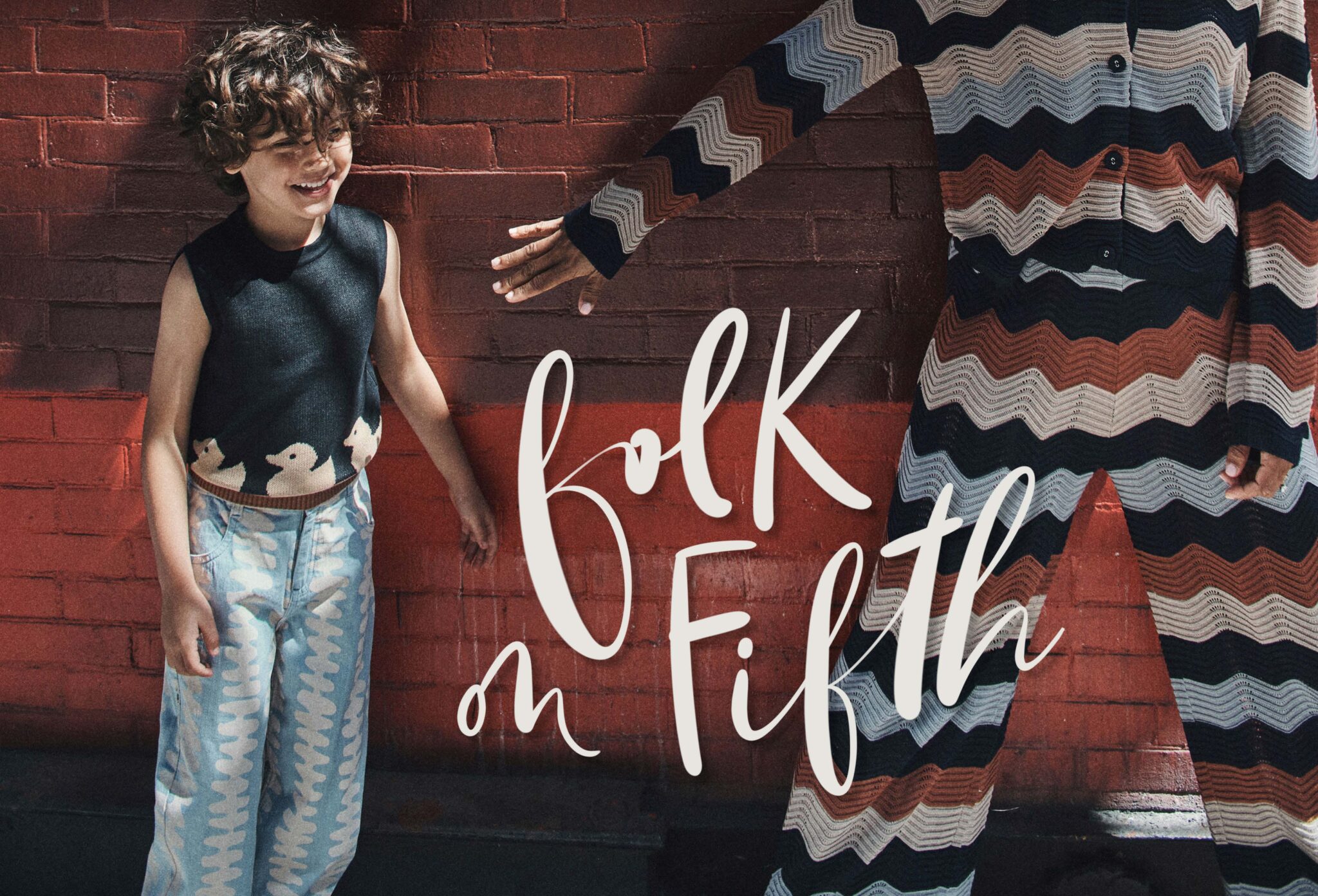 Young boy smiling in front of a red brick wall, wearing a sleeveless knit top with horse motifs and wavy patterned trousers. Next to him, an adult in a retro zigzag knit set reaches out playfully. Title text “Folk on Fifth.” Editorial by Franck Malthiery.