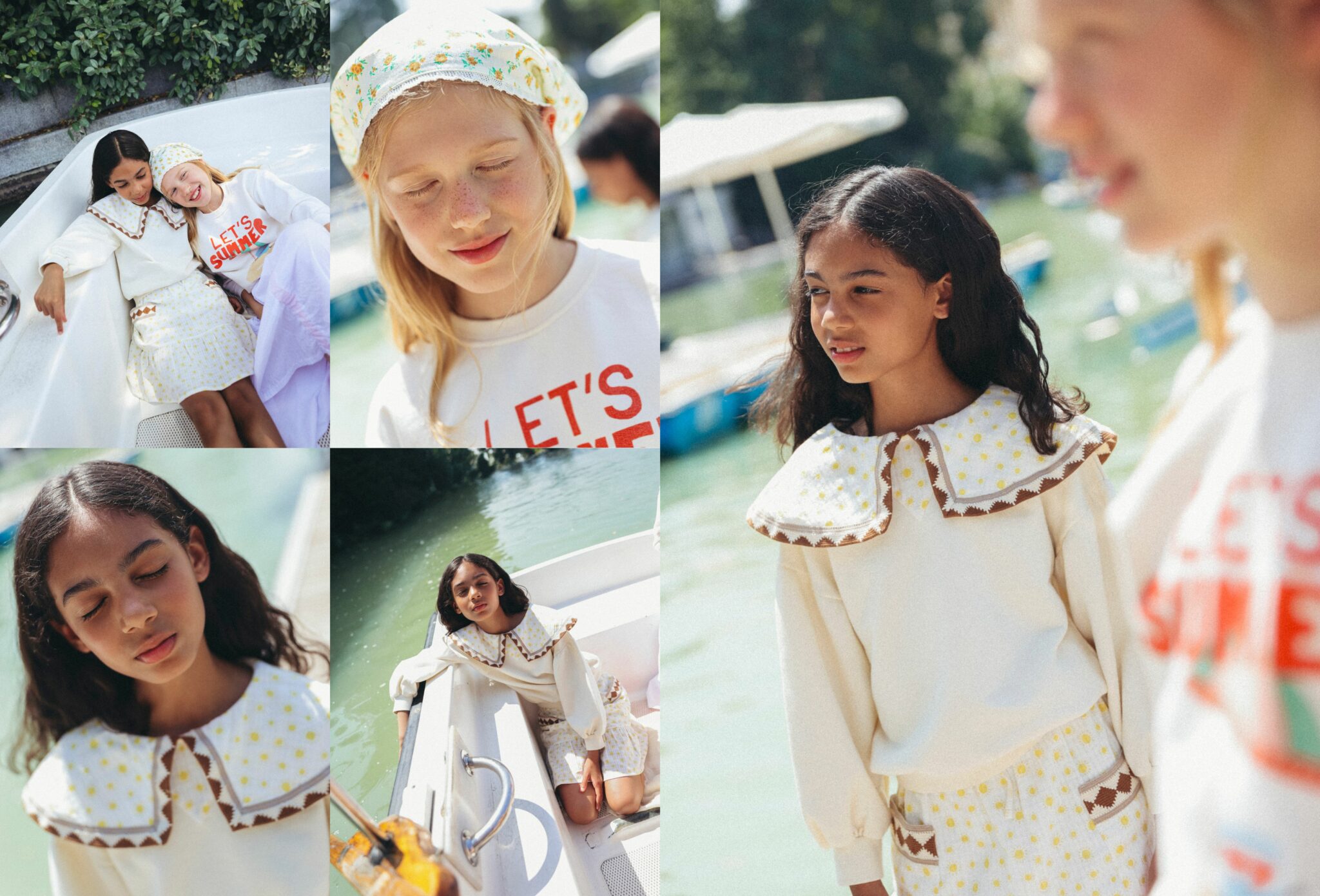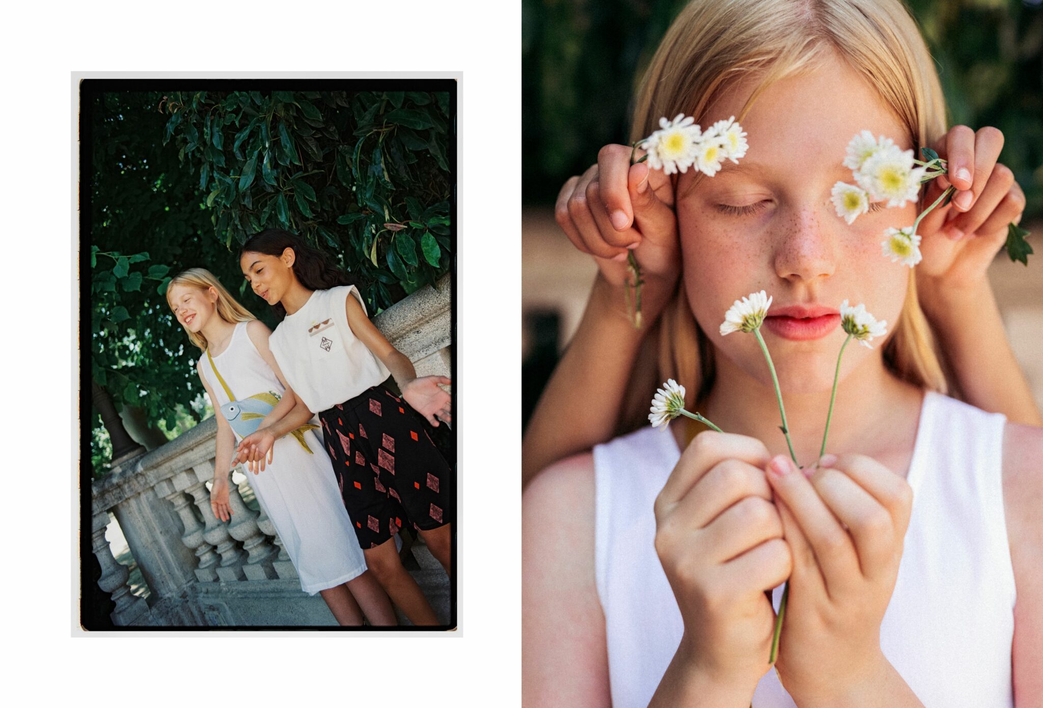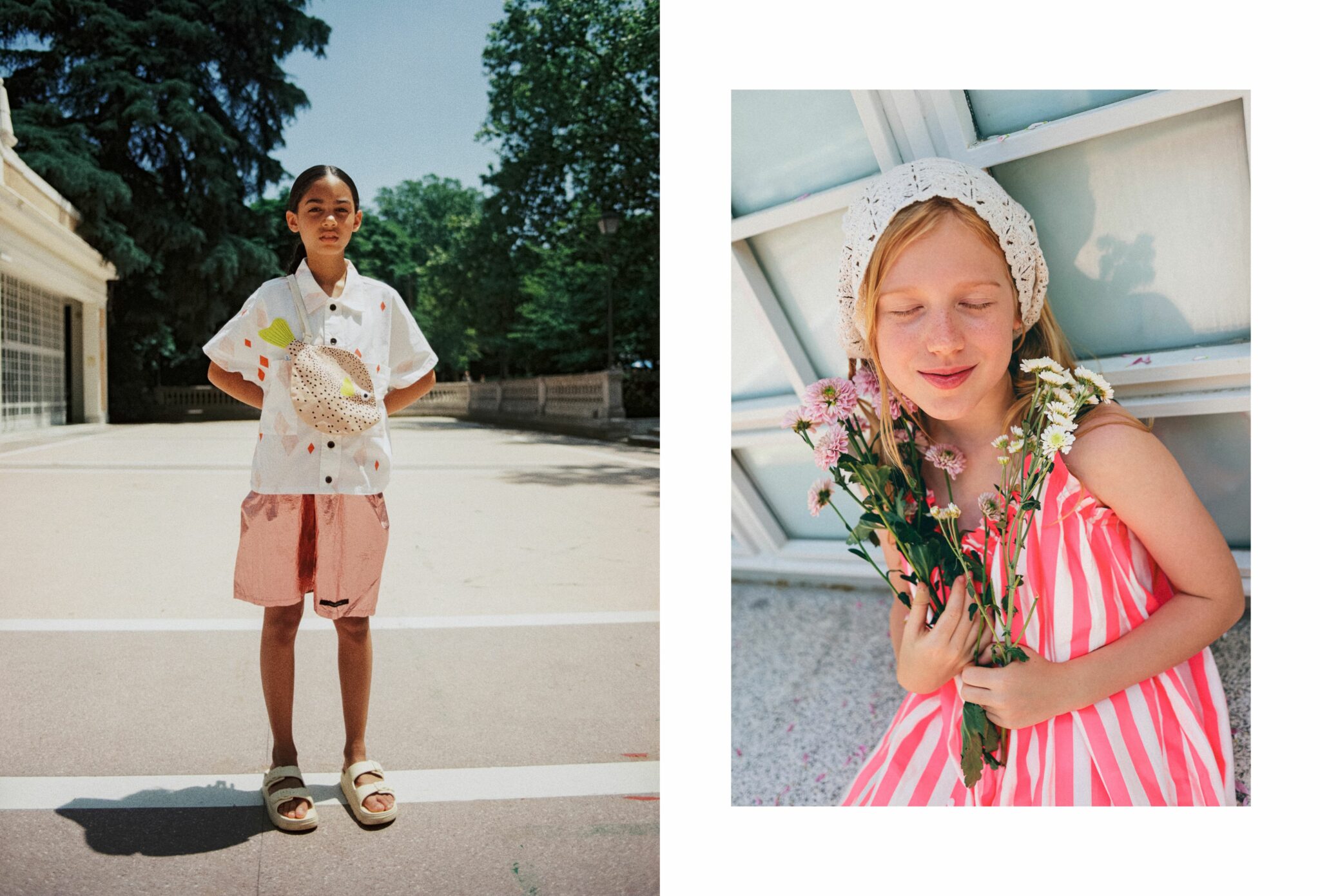 GALA – shirt and bermudas LITTLE CREATIVE FACTORY , bag DON FISHER; right page: ZLATA – dress LITTLE CREATIVE FACTORY.