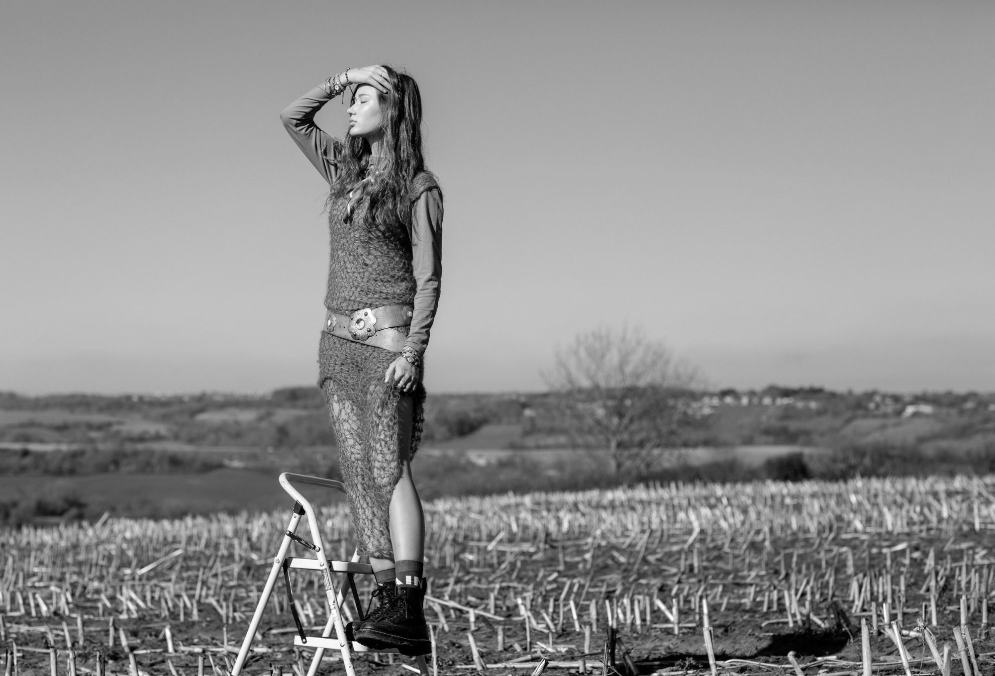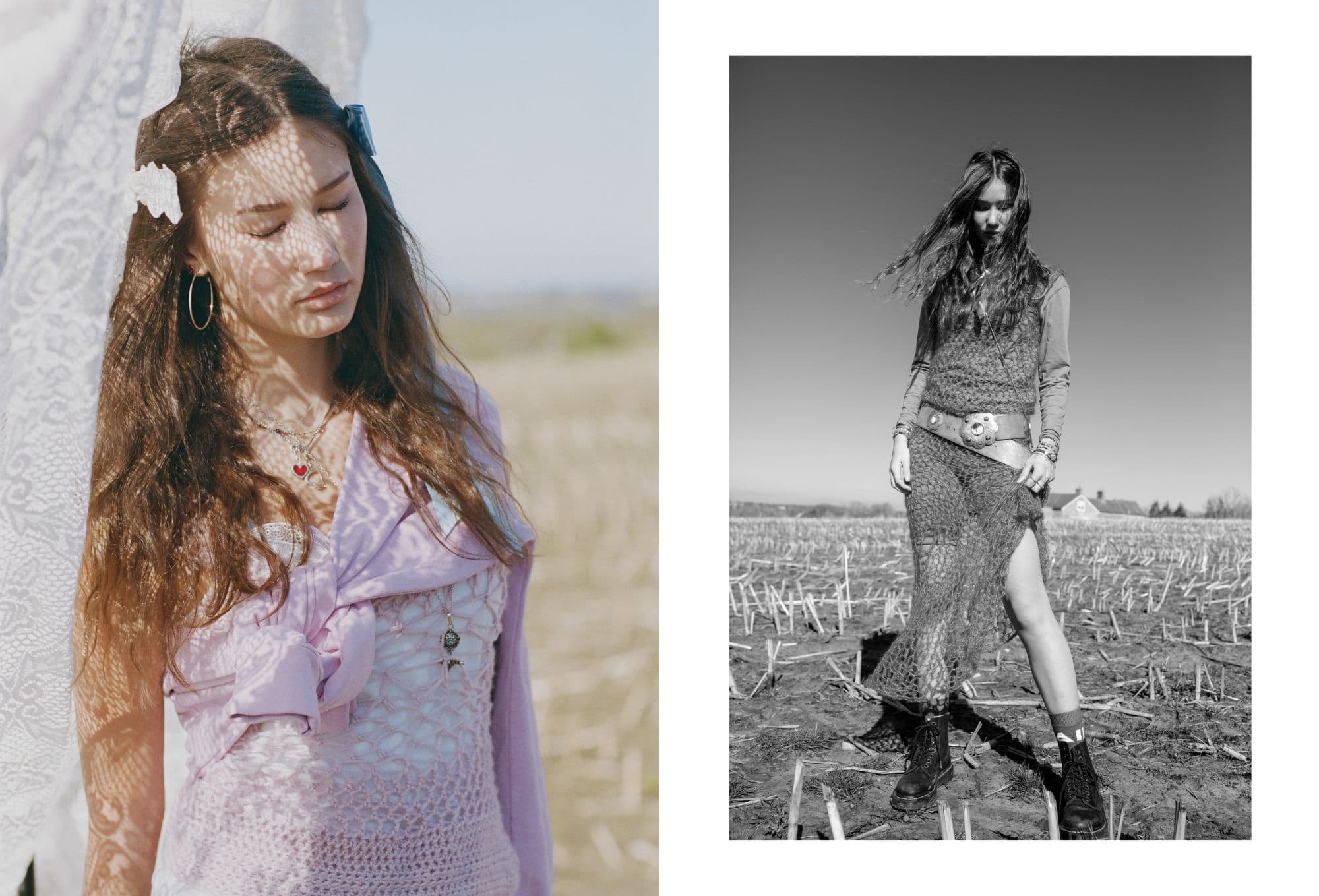 Alt text: Split image of a girl in a countryside field. On the left, she wears a lilac dress with a heart necklace and blue ribbon in her hair, standing under lace fabric casting a delicate shadow on her face. On the right, in black and white, she poses in a sheer knit dress with a high slit, a bold belt, and lace-up boots, her hair flowing in the wind against a backdrop of dry stubble and a distant farmhouse.
