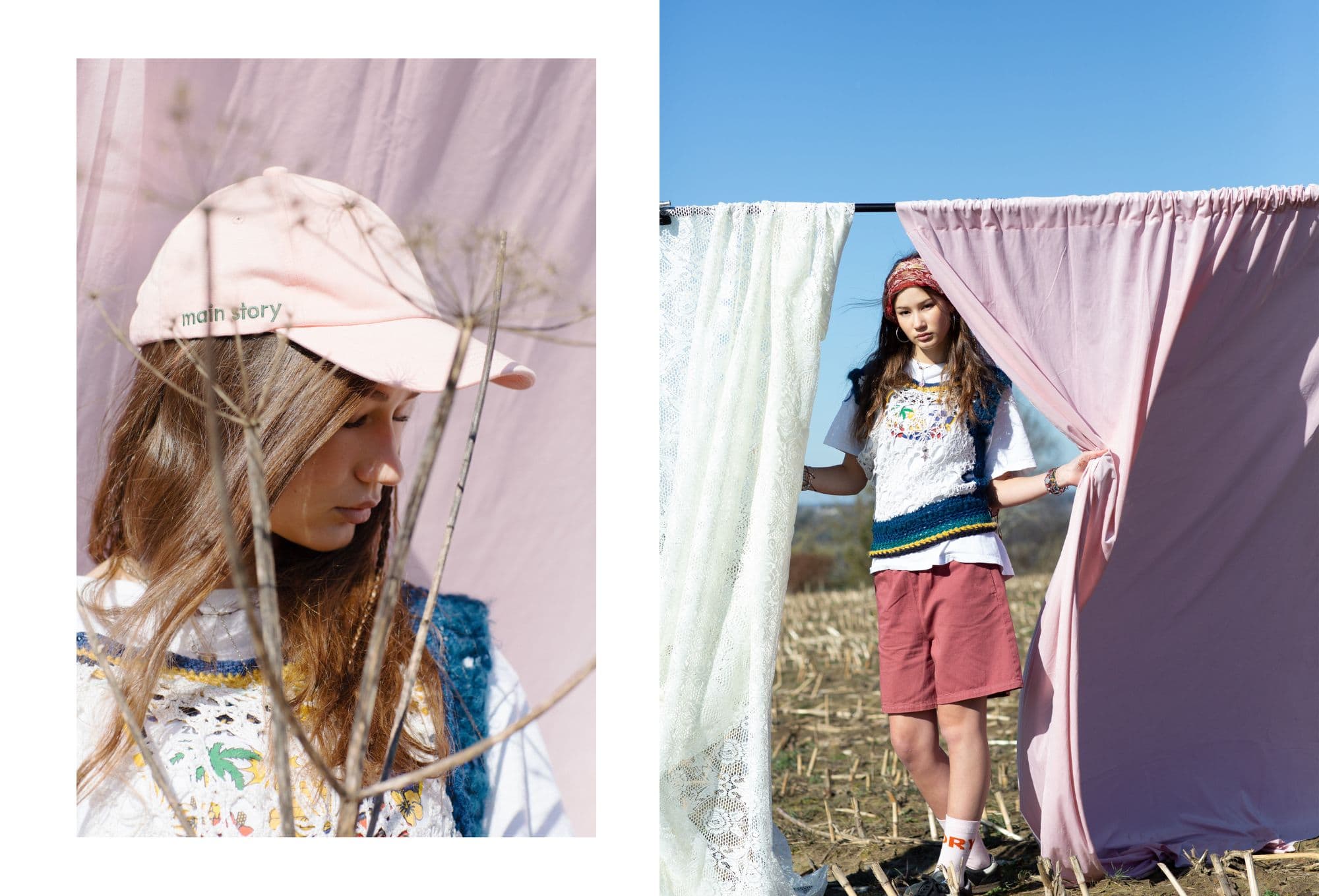 Girl standing in a harvested field, leaning between two hanging fabric panels—one white lace and one soft pink. She wears a crocheted vest layered over a white shirt, burgundy shorts, white socks with red lettering, and black shoes. A red patterned headscarf ties back her hair, and she squints into the sun with a peaceful expression. Rolling hills stretch out in the background under a clear blue sky.