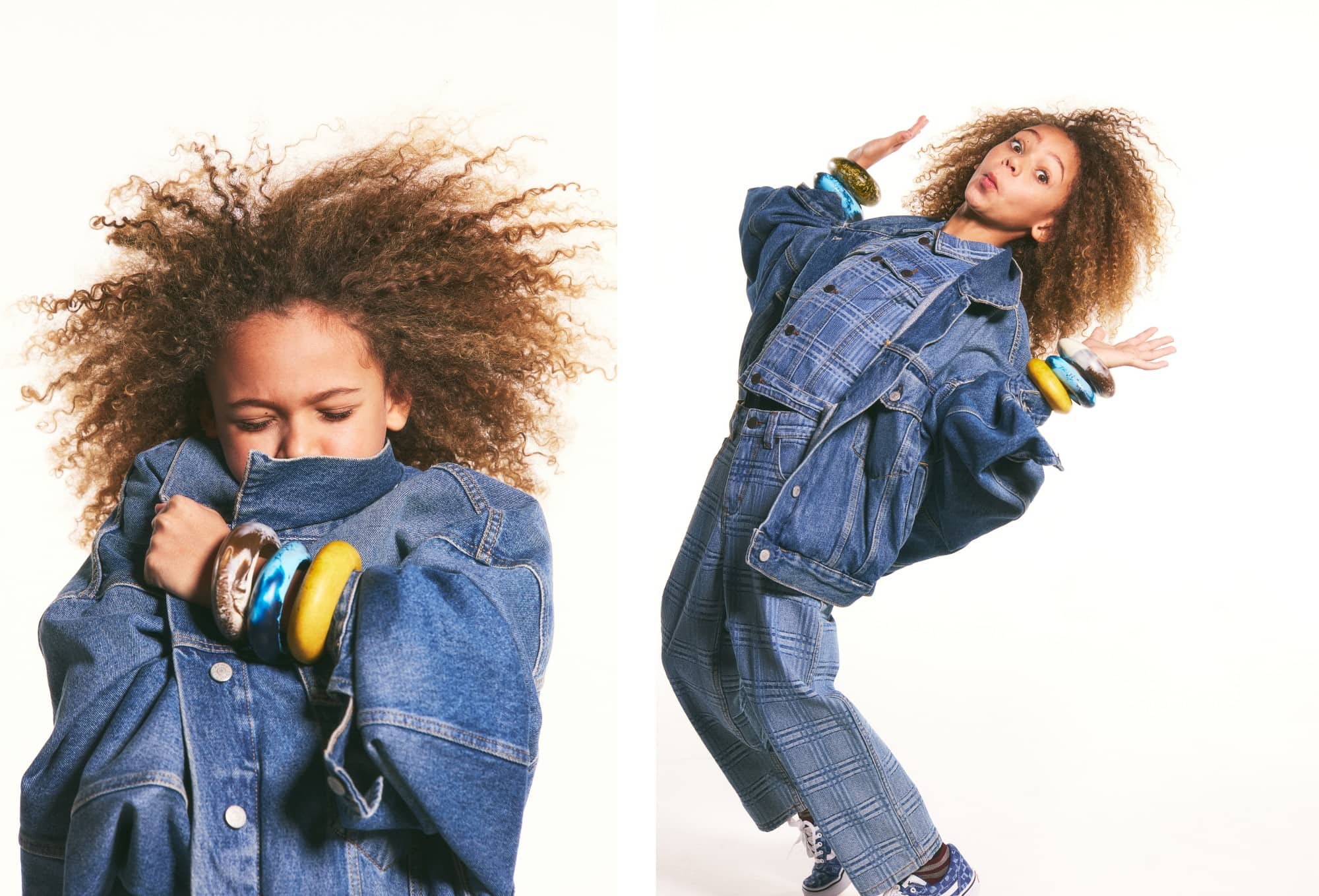 ELIANA – skirt and jacket GIVENCHY KIDS, shirt MOLO, necklaces DINOSAUR DESIGNS, barettes and hair bands RAINBOW UNICORN BIRTHDAY SURPRISE; left page: ELIANA – bucket hat, t-shirt, tank top and leggings BOBO CHOSES.